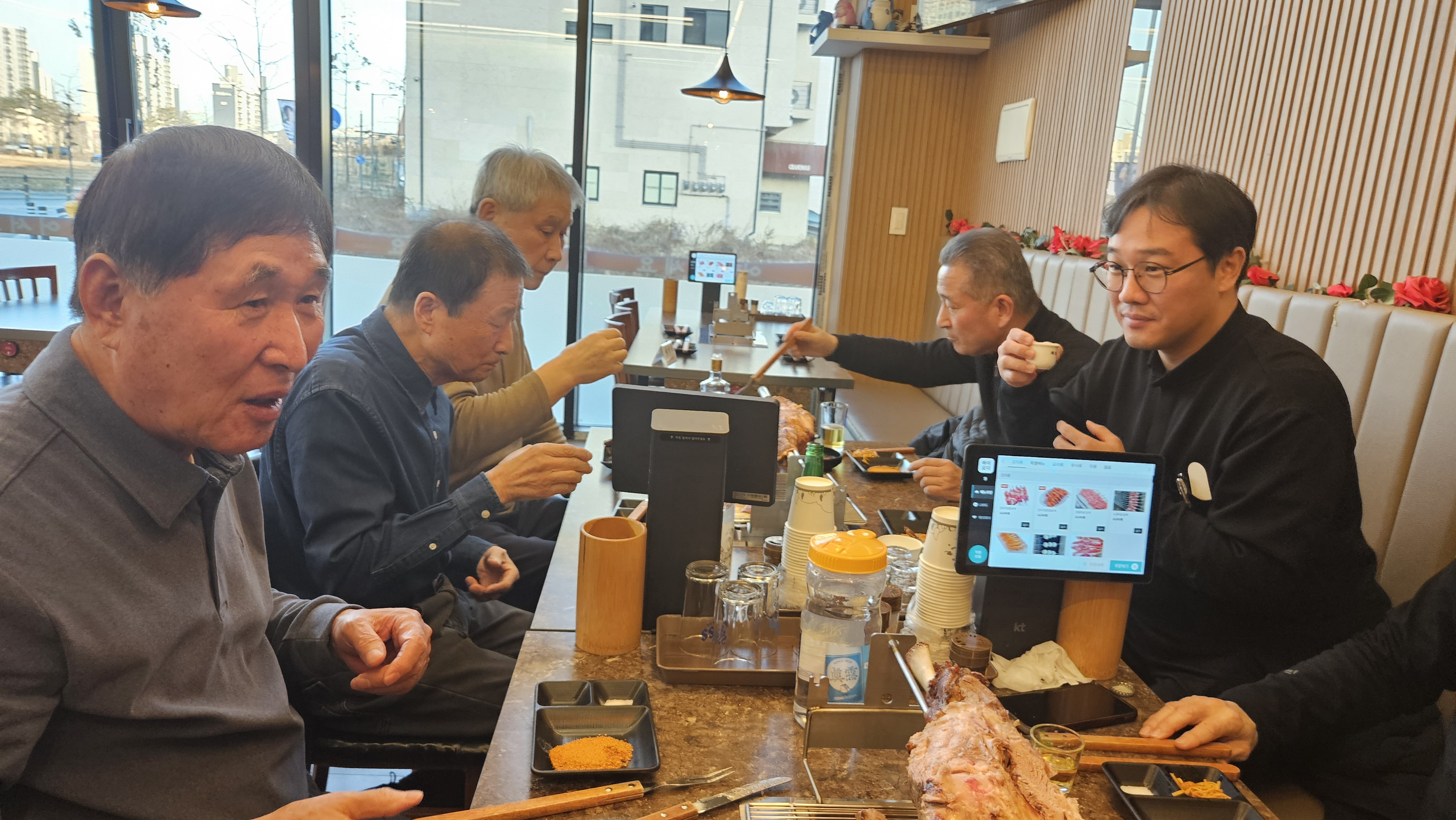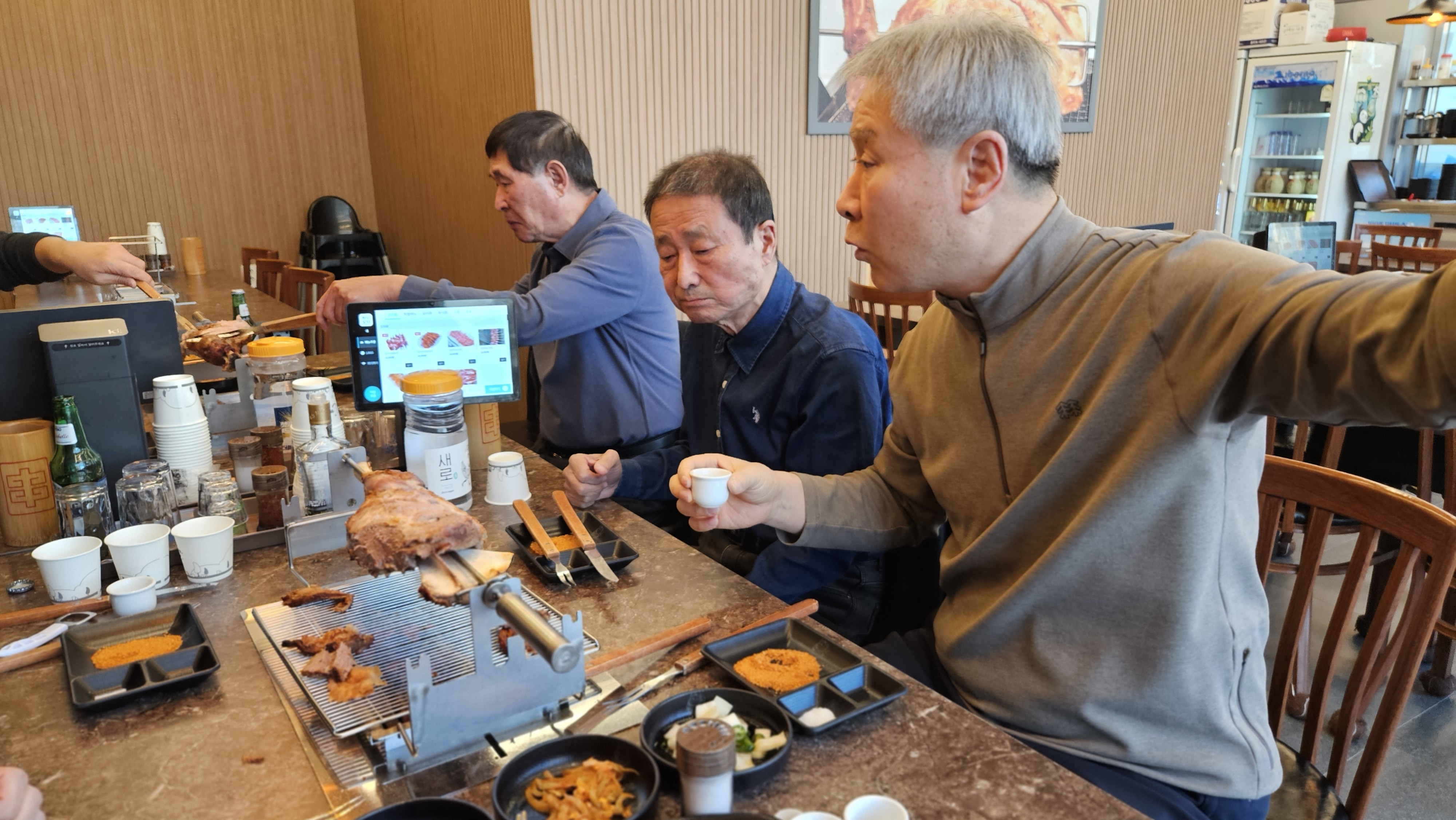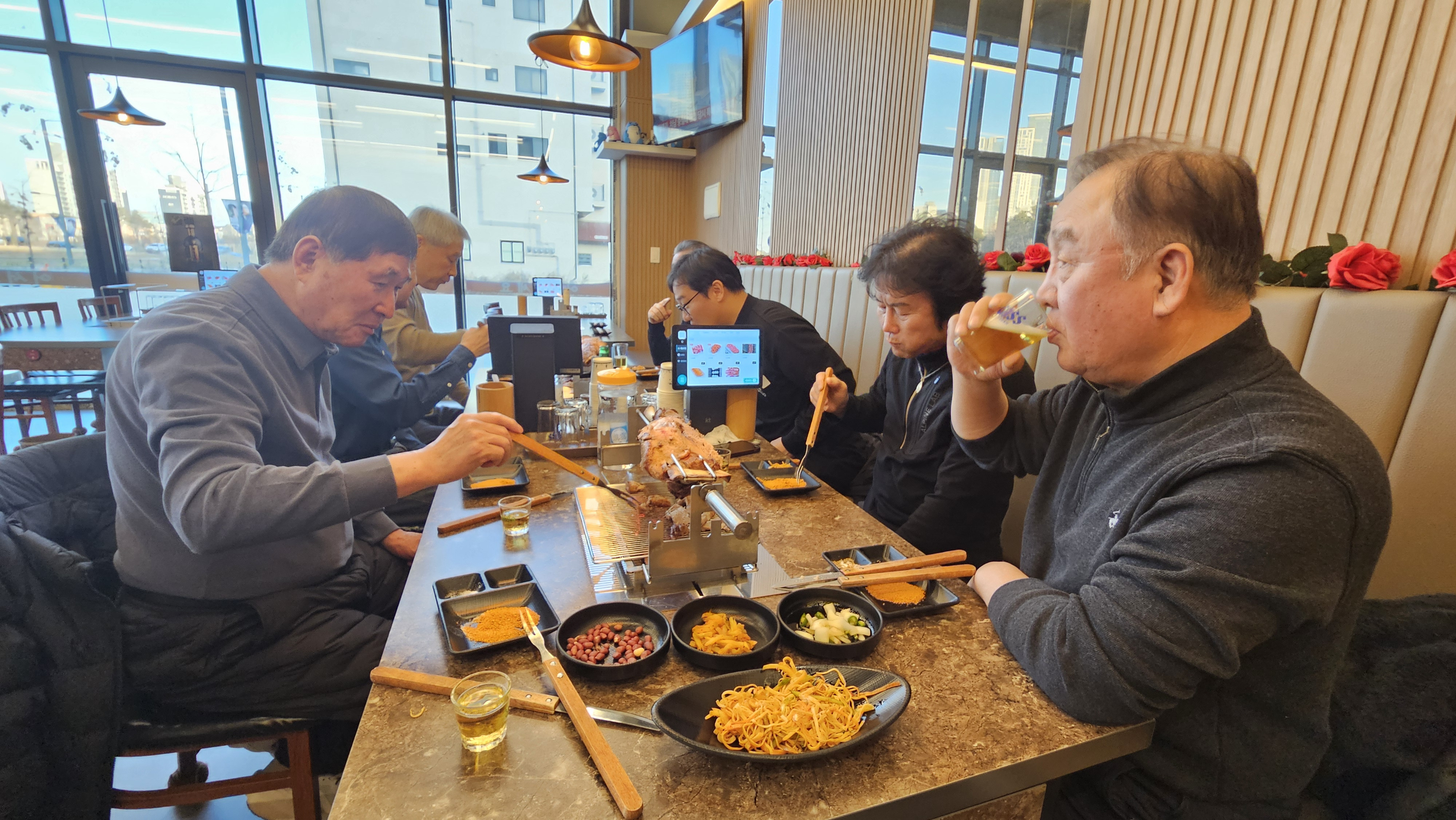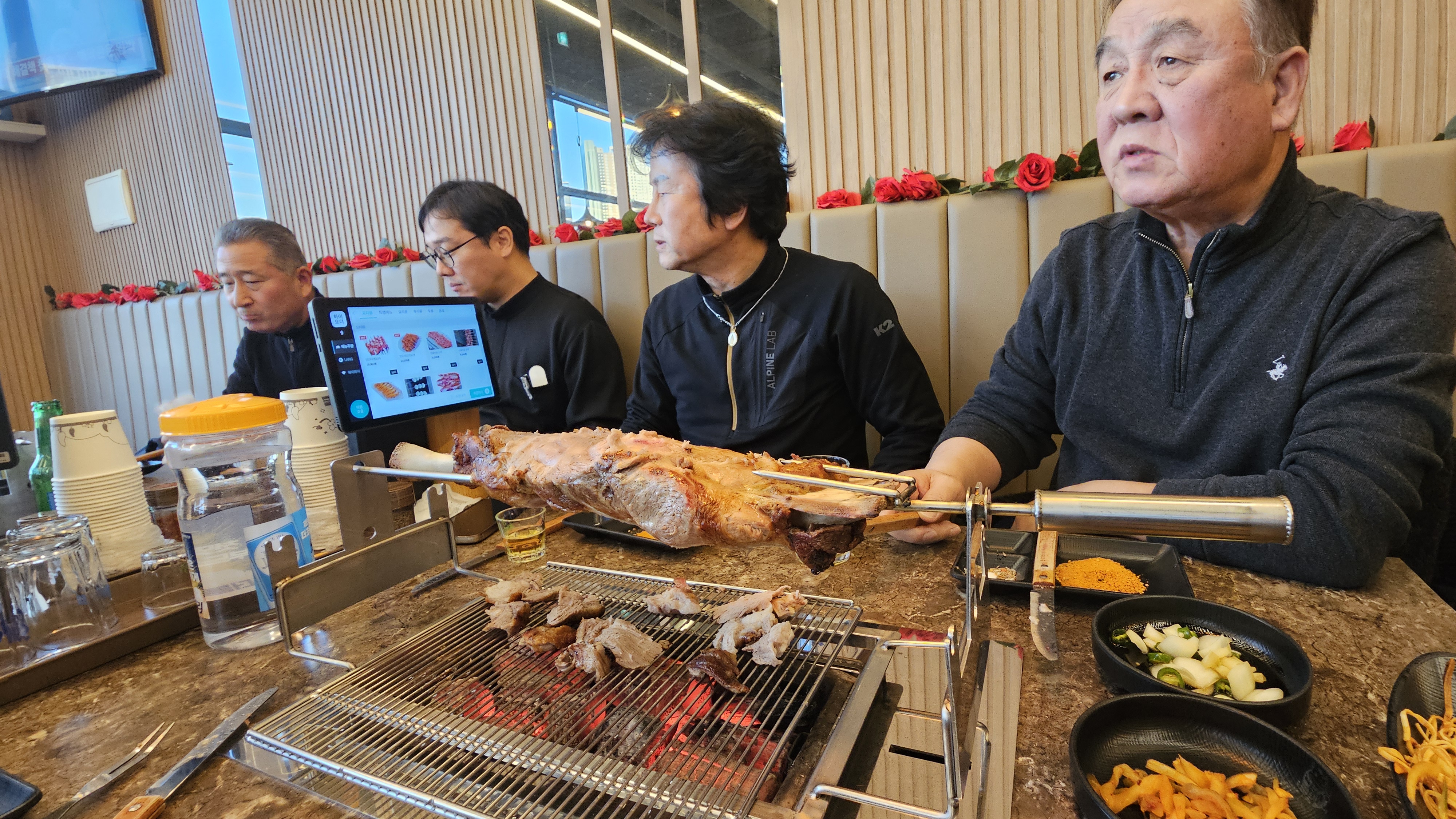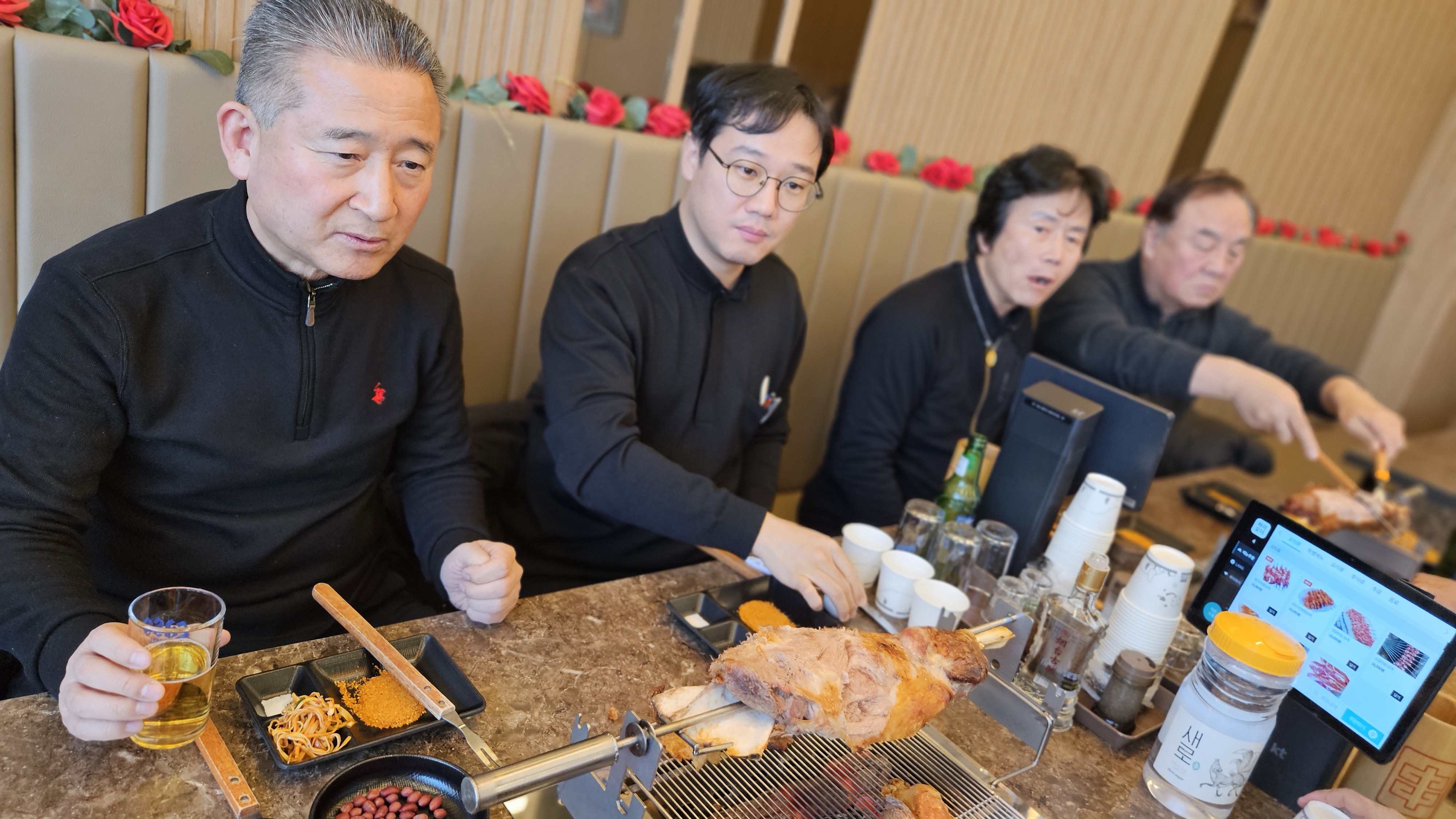 양다리 구이 2kg 2개를 두 테이블에서 얋게 썰어서 먹습니다.