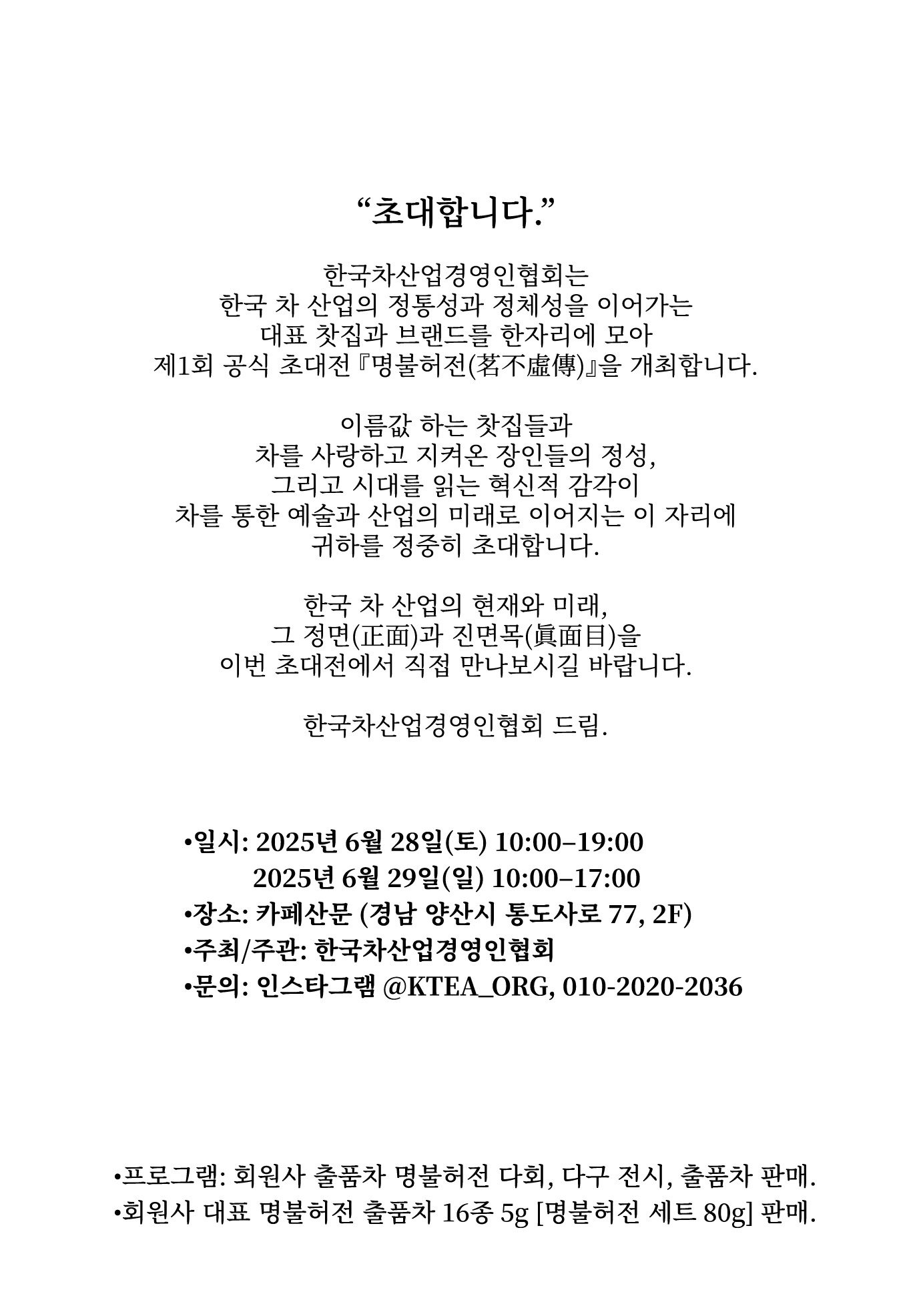 일시 2025년 6월 28,29일 장소 카페산문, 경남 양산시 통도사로 77 주최/주관 한국차산업경영인협회