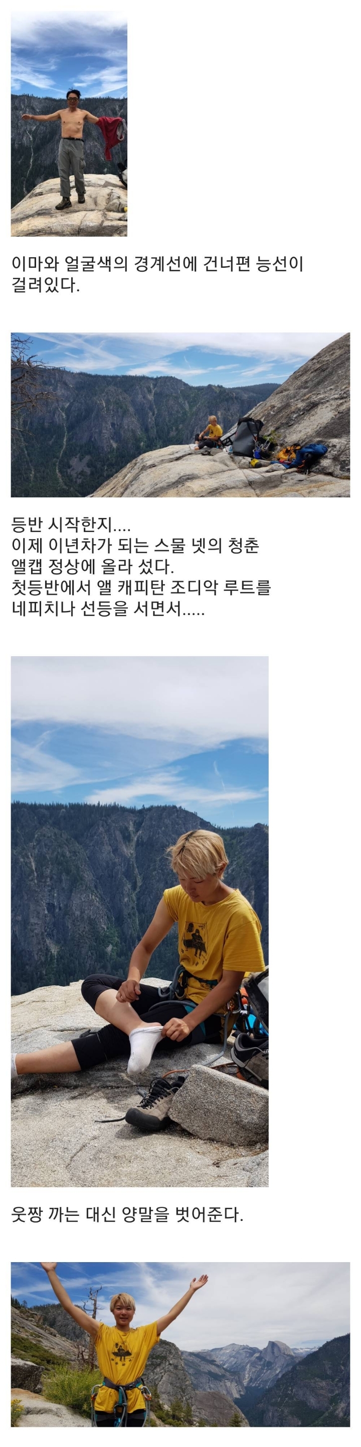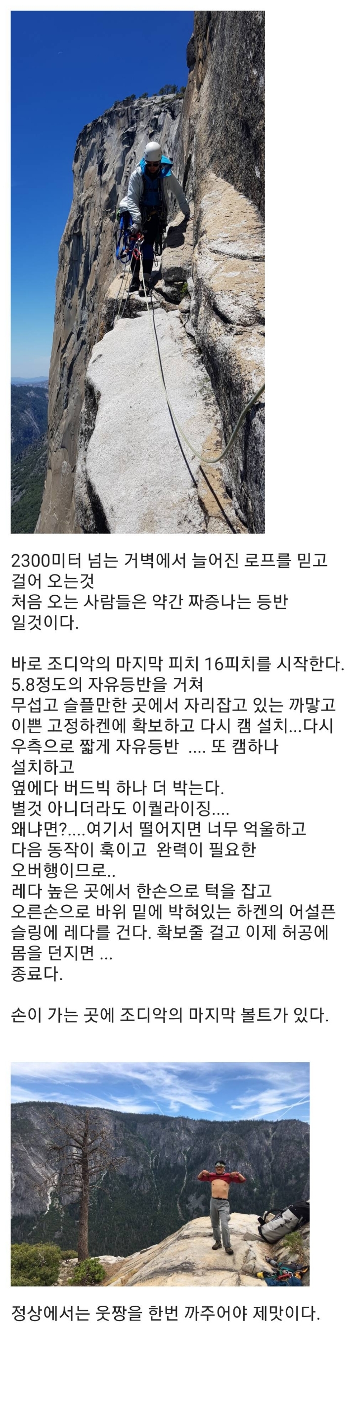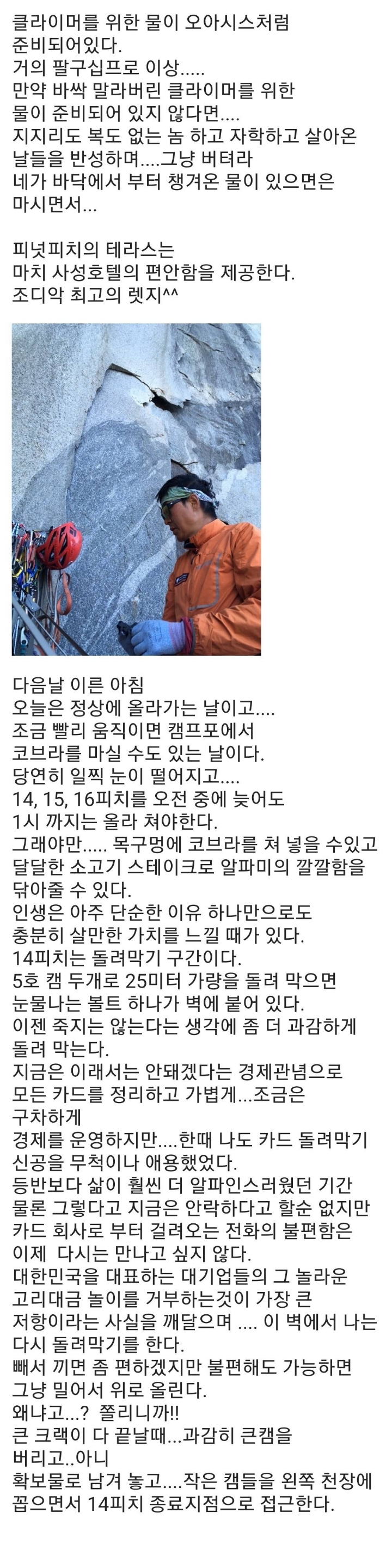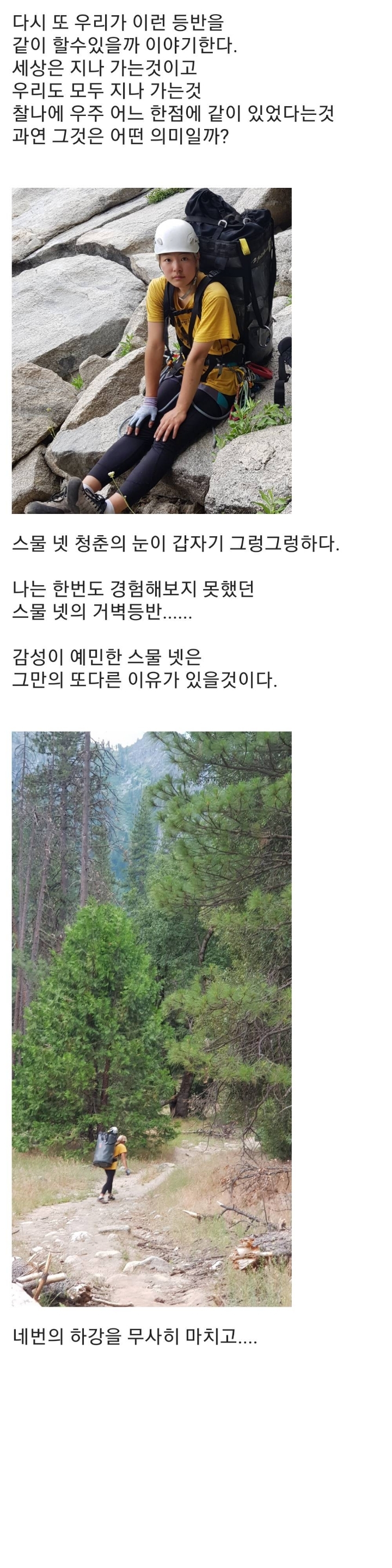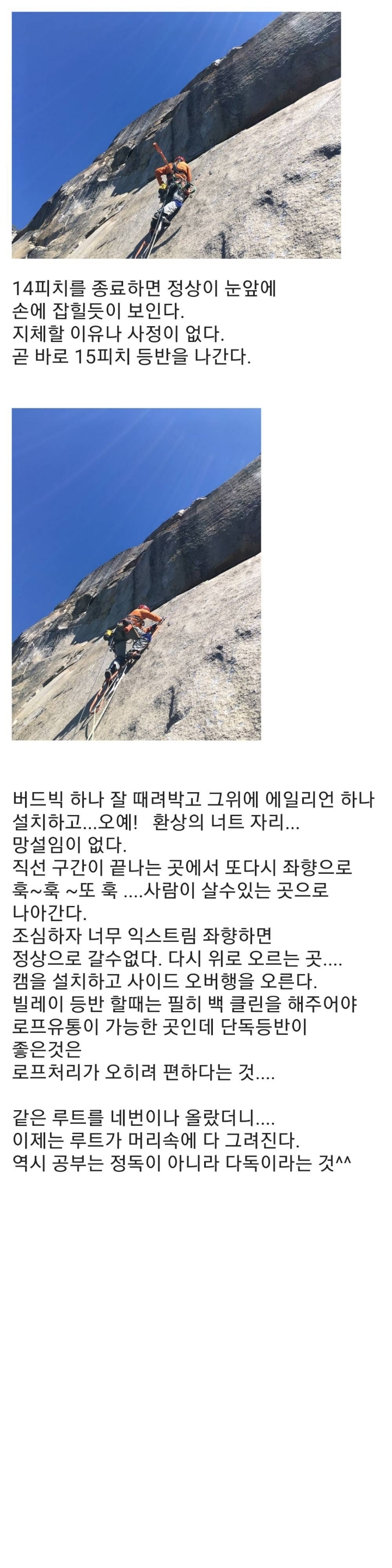 작성자이기성 작성시간 19.11.24 무슨 인연으로 만나고, 엘캡에 건 한 줄에 매달리고, 그 고난과 고뇌를 함께 그리워 하고.