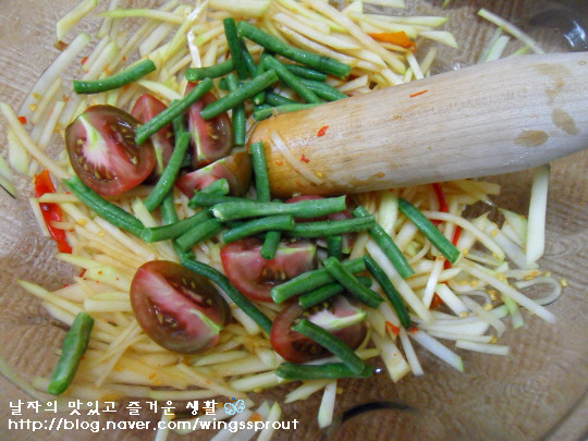 그린파파야 한 개, 토마토 2~3개, 스트링빈스 약간, 팜슈가, 태국고추, 피쉬소스, 레몬주스, 땅콩