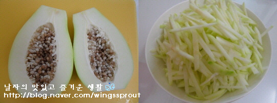 그린파파야 한 개를 껍질을 벗기고(감자 깎는 칼을 사용하심 편해요) 씨를 긁어내고