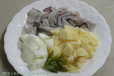 재료: 오징어한마리 , 감자 100g , 양파 100g, 청양고추2개,청양홍고추1/2개, 파1/2대