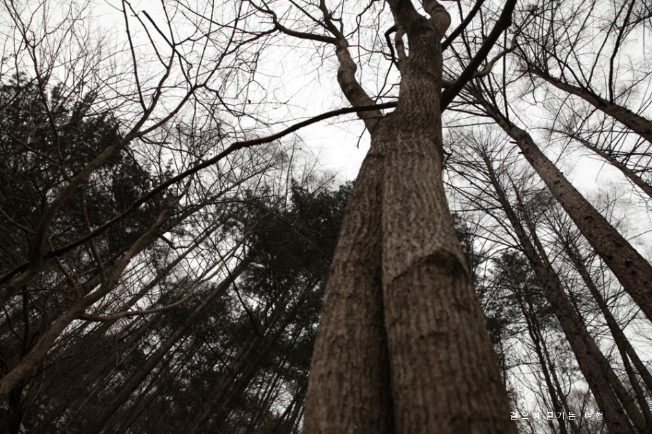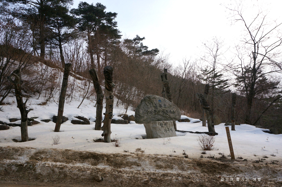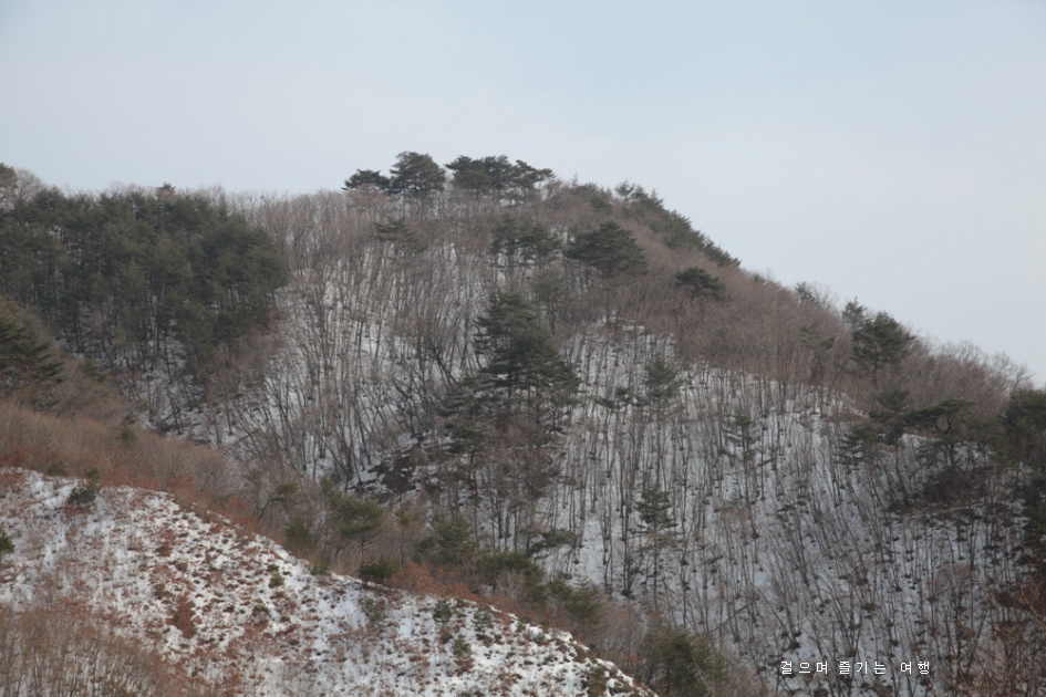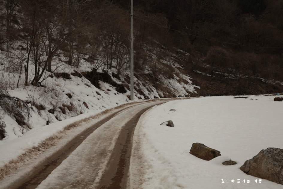 숲속 눈길을 따라 해발 500m 이상 올라가야 합니다.