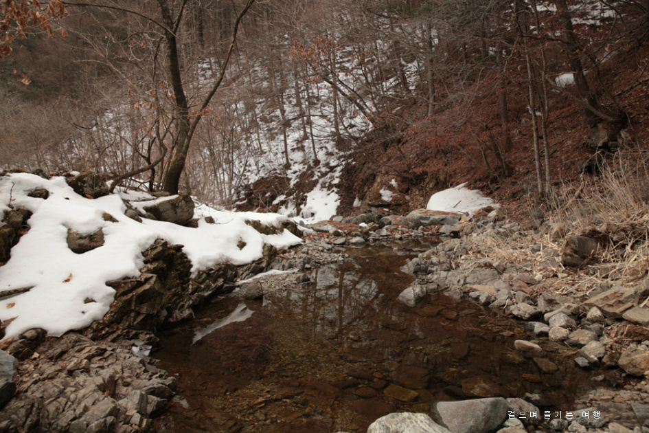 꽁꽁 얼었던 계곡의 양지 바른곳은 얼음이 녹아 물이 흐르기 시작 했네요