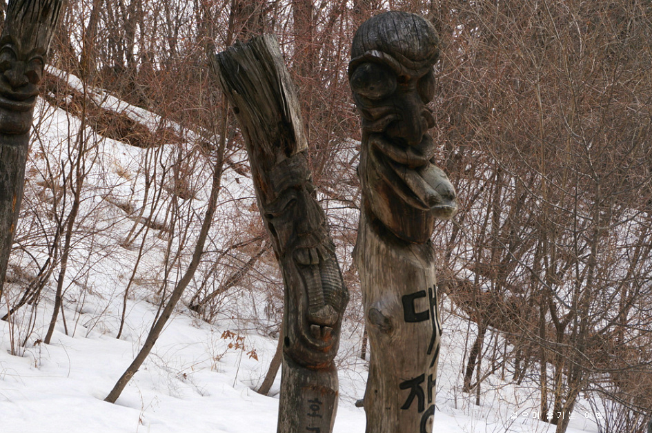 고갯마루에 올라서면 장승들이 방문객들을 반겨 줍니다.