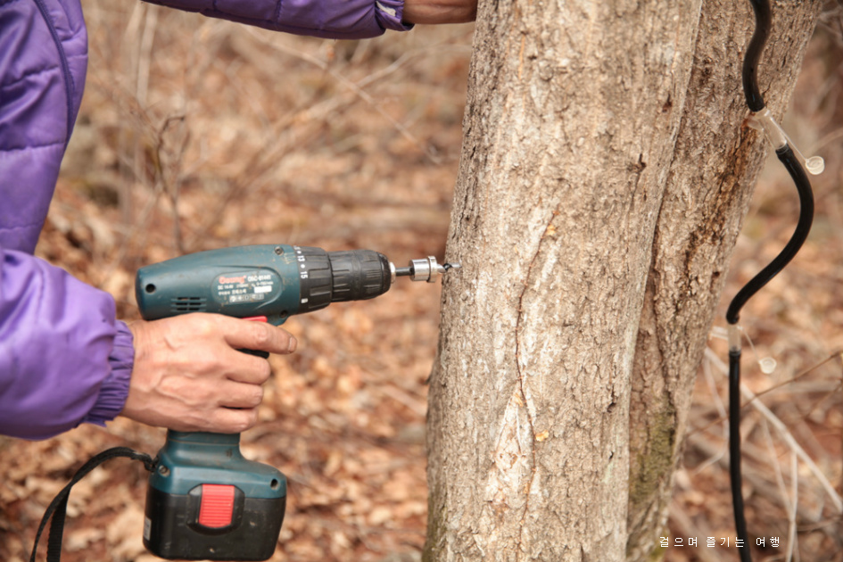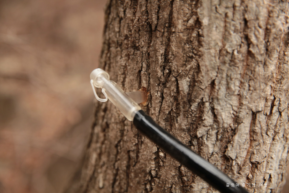 나무 피해가 최소화 하기 위하여 한나무에 2 ∼3개 구멍만 뚫고 물을 받습니다.