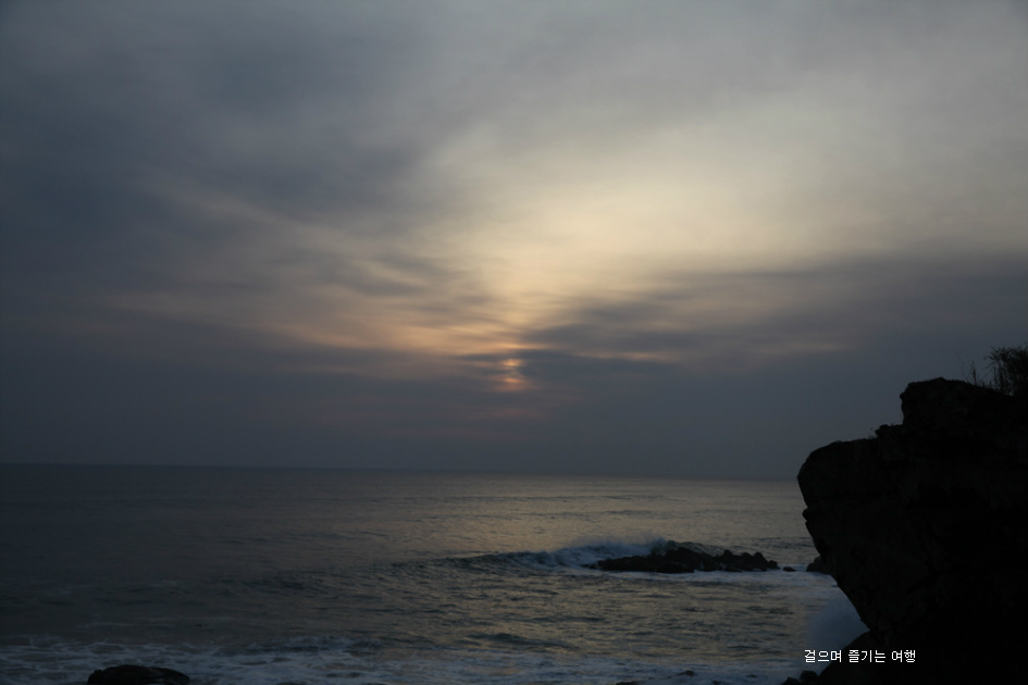 비록 수평선에 떠 오르는 태양은 볼 수 없지만 구름 사이로 잠깐 비추는 일출을 보며