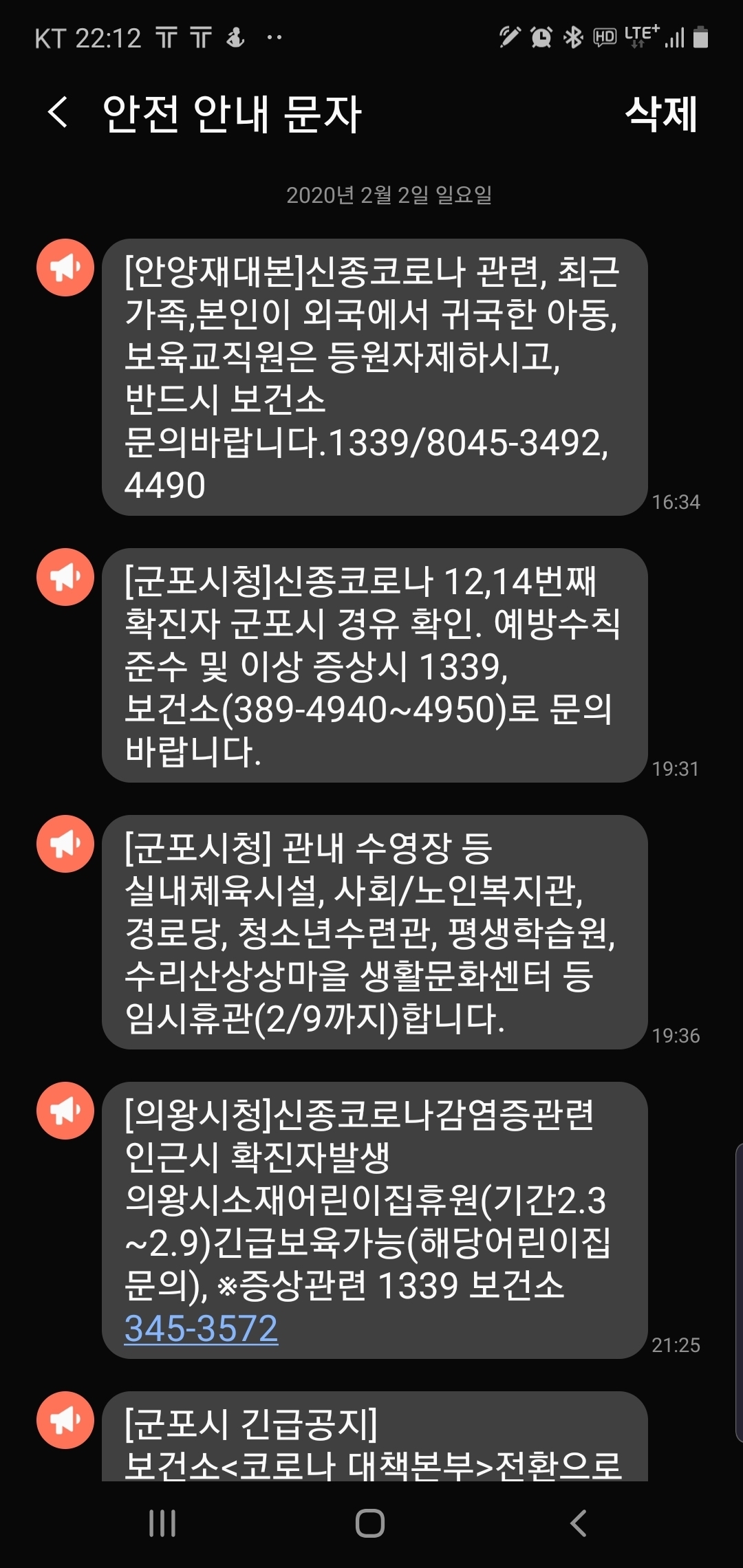 안전 안내문자 작성자13fret|작성시간20.02.02|조회수496 목록 댓글 2 글자크기 작게가 글자크기 크게가 공무원들 열일 하네요오늘 하루 5통 받았네요 다음검색 현재 게시글 추가 기능 열기 북마크 신고 센터로 신고 댓글 댓글 2 댓글쓰기 답글쓰기 댓글 리스트 작성자마음의여유 | 작성시간 20.02.02 저는 한통도 못받았는대 작성자호박나라 | 작성시간 20.02.02 당연해야죠 본분인디 댓글 전체보기