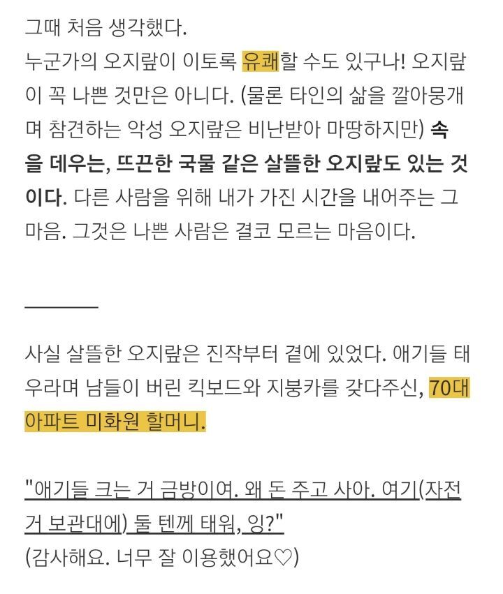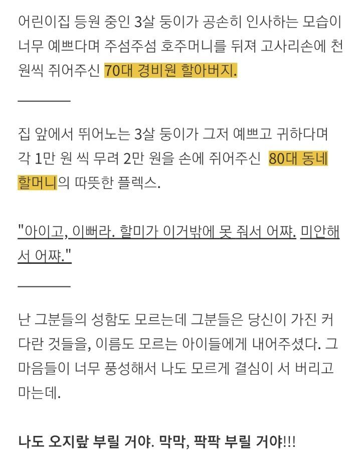 어느 아이 엄마의 세상사는 이야기 작성자밤길파수꾼|작성시간21.08.27|조회수507 목록 댓글 2 글자크기 작게가 글자크기 크게가 다음검색 현재 게시글 추가 기능 열기 북마크 신고 센터로 신고 댓글 댓글 2 댓글쓰기 답글쓰기 댓글 리스트 작성자캐니스 | 작성시간 21.08.27 오지랖이 아닌 인간애 이지요 작성자동수 | 작성시간 21.08.28 참 보기 좋구먼~~^ 댓글 전체보기