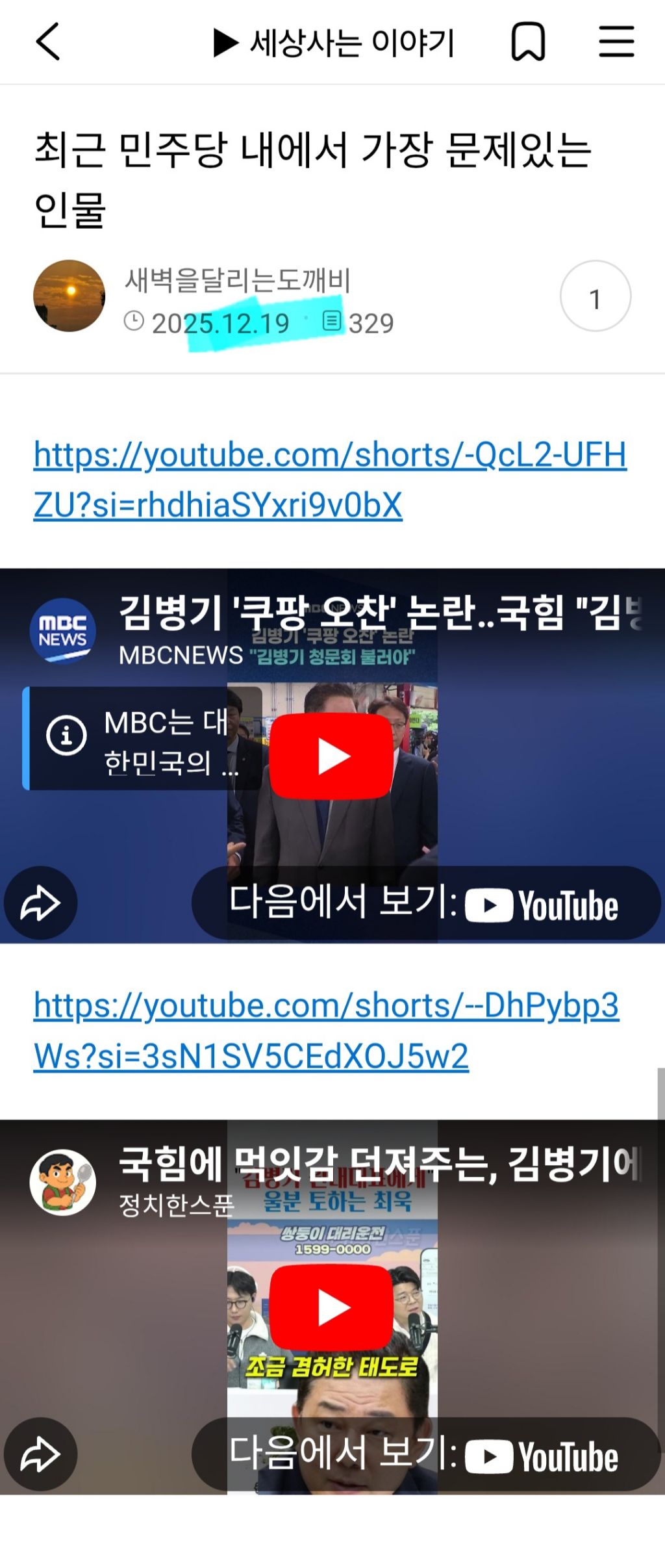 요인간이 하루후엔 바로 태세전환하고 김병기까는 숏츠올리며 비판하네요.