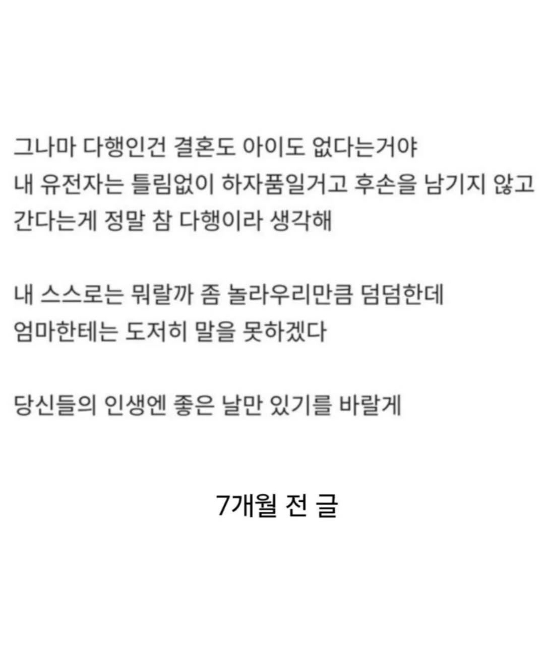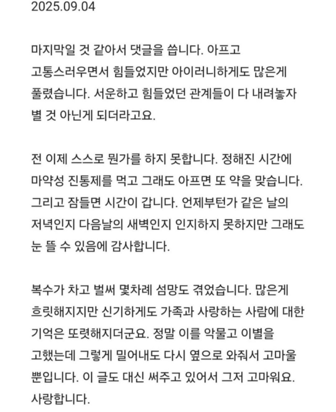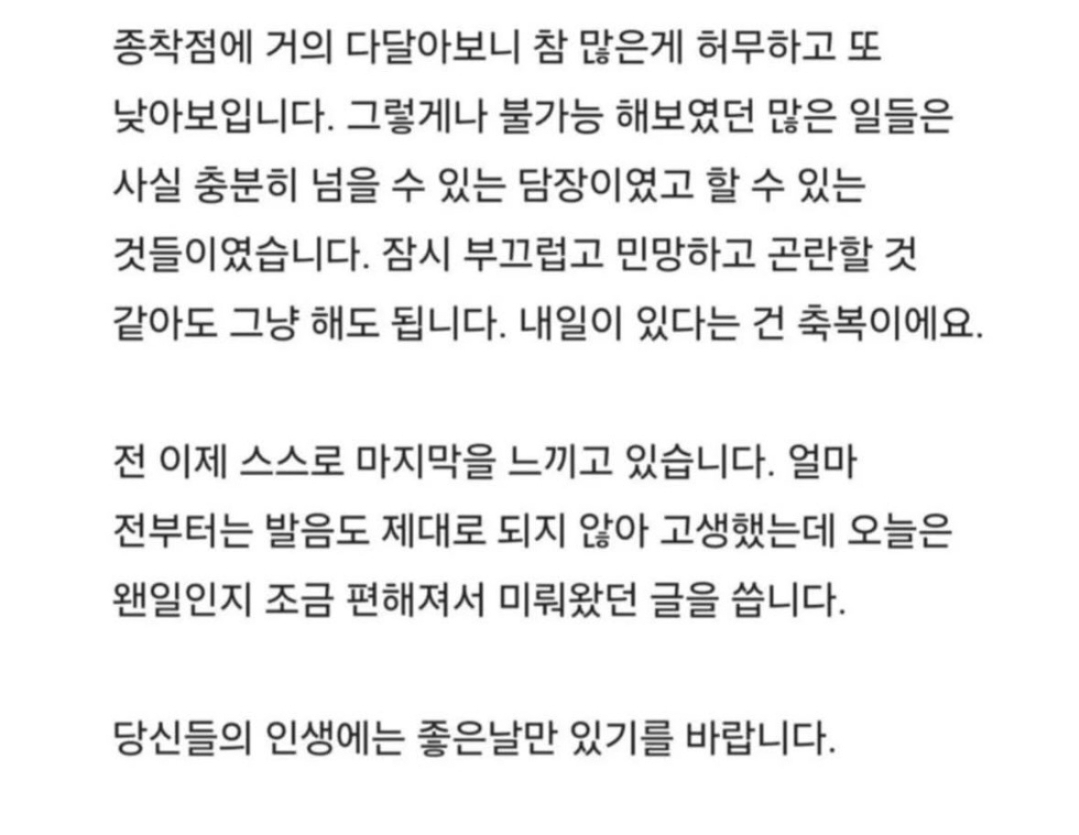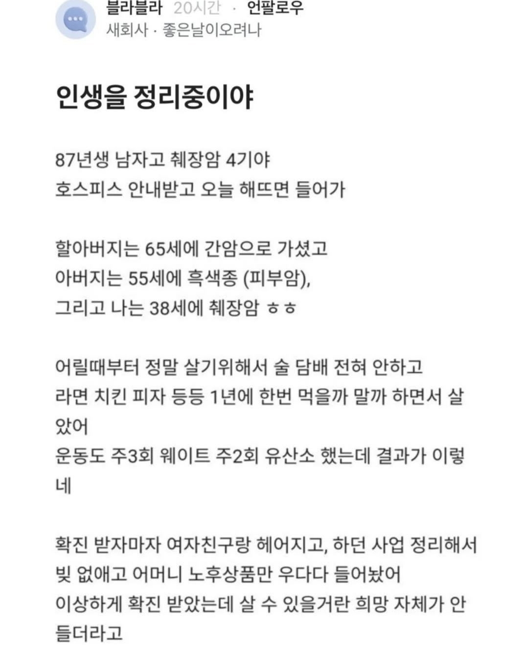 [스크랩] 87년생 췌장암 4기의 인생을 정리하는 법.blind 작성자이츠키|작성시간26.03.22|조회수256 목록 댓글 2 글자크기 작게가 글자크기 크게가 인스타 @drawing_pio출처: blind 다음검색 스크랩 원문 : *여성시대* 차분한 20대들의 알흠다운 공간 현재 게시글 추가 기능 열기 북마크 신고 센터로 신고 댓글 댓글 2 댓글쓰기 답글쓰기 댓글 리스트 작성자이츠키 작성자 본인 여부 작성자 | 작성시간 26.03.22 난 어떻케 죽을까?? 대리 4기가 있다면 안면 있는 대리기사 만나며 인사라도 할텐데어느날 밤이슬 맞다 길거리에서 죽진 않을련지... 작성자로드킬 | 작성시간 26.03.22 길에서 죽음 집에 보상금이라도 남기져 병으로 서서히 말라 죽음, 그게 힘든거 댓글 전체보기