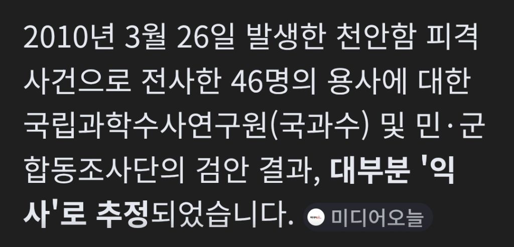 아직도 논란인 천안함 사고 작성자새벽을달리는도깨비|작성시간26.03.27|조회수197 목록 댓글 1 글자크기 작게가 글자크기 크게가 국방의 의무를 수행하다 사망한46명 국군장병의 명복을빕니다강력한 수중폭발 모습 https://youtu.be/hRrKbU8OG5M?si=NG_70DqfcoJoOrvg 다음검색 현재 게시글 추가 기능 열기 북마크 신고 센터로 신고 댓글 댓글 1 댓글쓰기 답글쓰기 댓글 리스트 작성자탄산수땡기네 | 작성시간 26.03.27 천안함 나무위키 참조하세요. 판단에 도움이 되실겁니다. 이미지 확대 댓글 전체보기