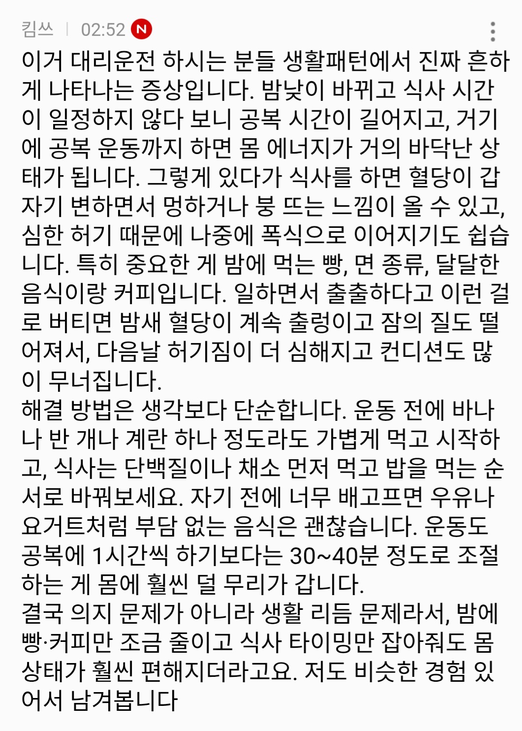 대리운전 하면서는 “배부르게 먹는다”기보다 "안 배고플 정도만 먹는다"는 느낌이 중요한 것 같습니다. 보통 한 번에 바나나 1개, 많아도 2개 정도면 충분합니다. (바나나 1개 + 삶은 계란 1개,