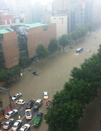 강남역 인근에 자리잡은 한국 최대기업 삼성전자의 사옥도 예외는 아니어서, 침수를 우려한 직원들이 급히 모래 제방을 쌓는 등 좀처럼 보기 힘든 상황까지 연출됐다.