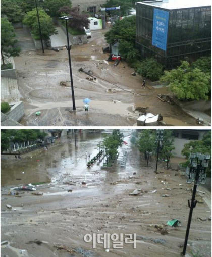 예술의전당이 자리잡은 서울 서초구 우면산 자락에 폭우로 산사태가 일어나 예술의전당 일대로 토사가 밀려든 것.