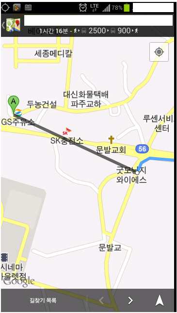 지도 화살표 표시대로 걷는다 어두워서 led 후레쉬 켜고 문발리 정류장도착