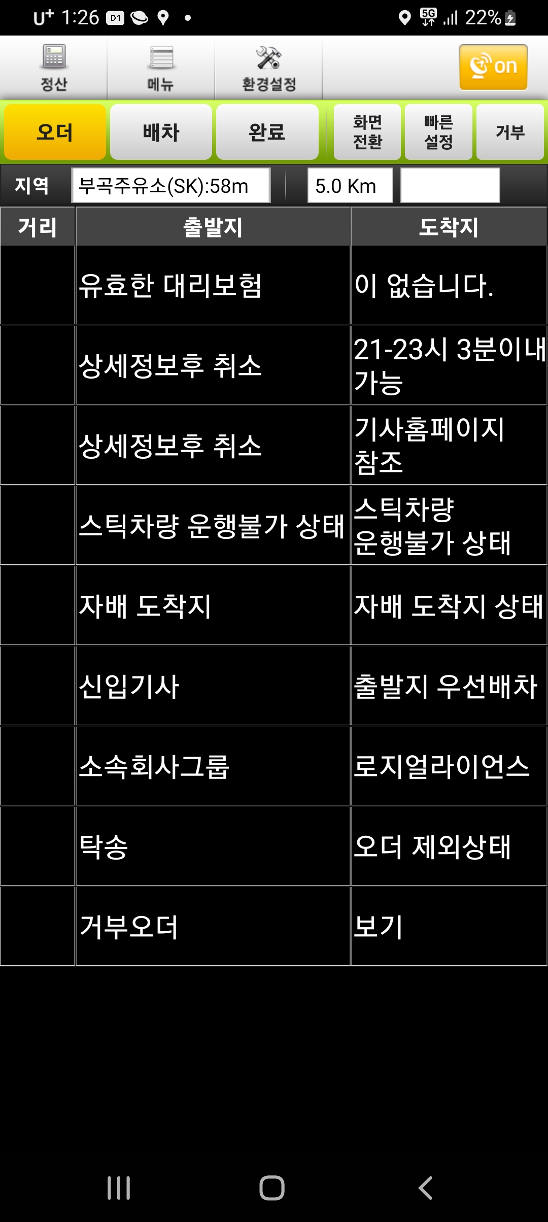 오더화면에 있는거 하나 아무거나 클릭해보니, 뭔 자동배차 받을수 없다 뜨구, 뭐가 뭔지.