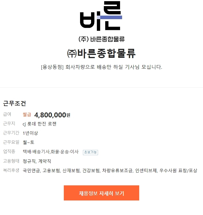 【㈜바른종합물류】[용상동점] 회사차량으로 배송만 하실 기사님 모십니다. 작성자아톰J|작성시간23.02.21|조회수370 목록 댓글 4 글자크기 작게가 글자크기 크게가 【㈜바른종합물류】[용상동점] 회사차량으로 배송만 하실 기사님 모십니다.http://joburl.kr/bOIZ6㈜바른종합물류 : [용상동점] 회사차량으로 배송만 하실 기사님 모십니다. - 알바몬근무지역 : cj 롯데 한진 로젠, 급여 : 월급 4,800,000, 마감일 : 상시모집www.albamon.com 다음검색 현재 게시글 추가 기능 열기 북마크 신고 센터로 신고 댓글 댓글 4 댓글쓰기 답글쓰기 댓글 리스트 작성자라이트켜 | 작성시간 23.02.21 회사차량? 지입이네요 월급480? 작성자아토믹 | 작성시간 23.02.21 택배잖아요 작성자이코다 | 작성시간 23.02.21 택배는 젊은 청년이 알바로. 잠깐 작성자그냥블루 | 작성시간 23.02.21 택배하다가 무릎 나감(탑차 오르락내리락) ㅋ 댓글 전체보기