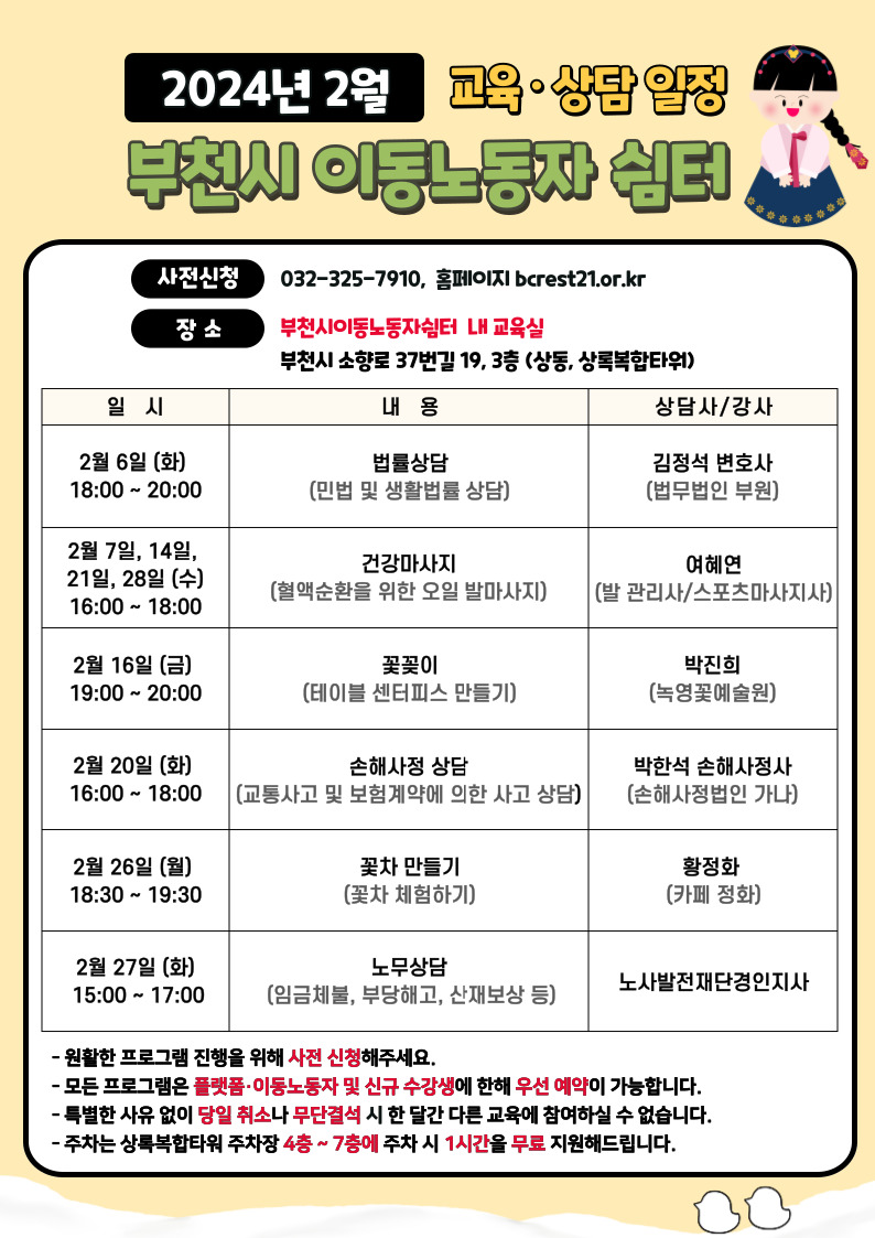 [부천시 이동노동자 쉼터] 2월 무료 교육 및 상담 일정 안내