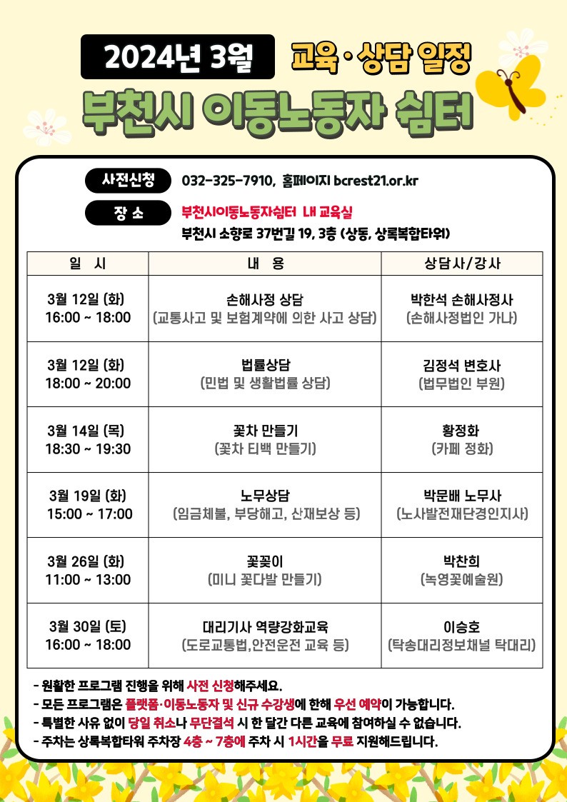 "부천시 이동노동자 쉼터" 3월 프로그램 참가자 모집이 현재 진행 중이오니, 많은 관심과 참여 부탁드립니다.