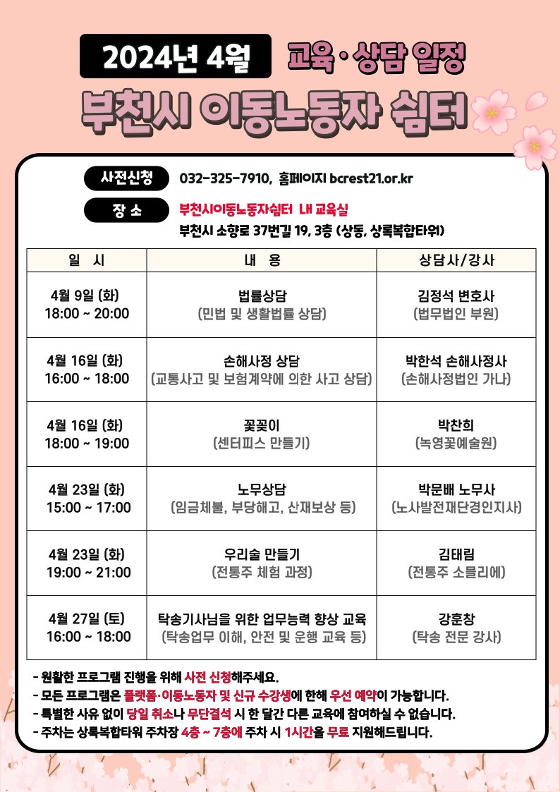 "부천시 이동노동자 쉼터" 4월 프로그램 참가자 모집이 현재 진행 중이오니, 많은 관심과 참여 부탁드립니다.