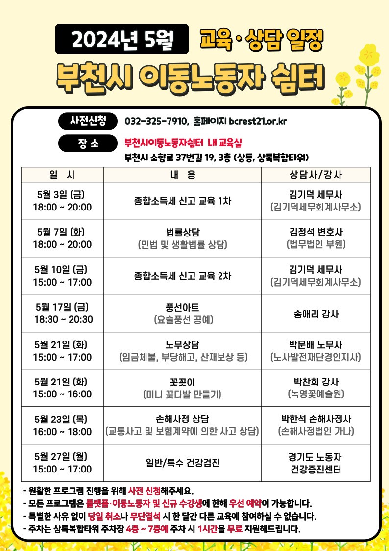 "부천시 이동노동자 쉼터" 5월 프로그램 참가자 모집이 현재 진행 중이오니, 많은 관심과 참여 부탁드립니다.