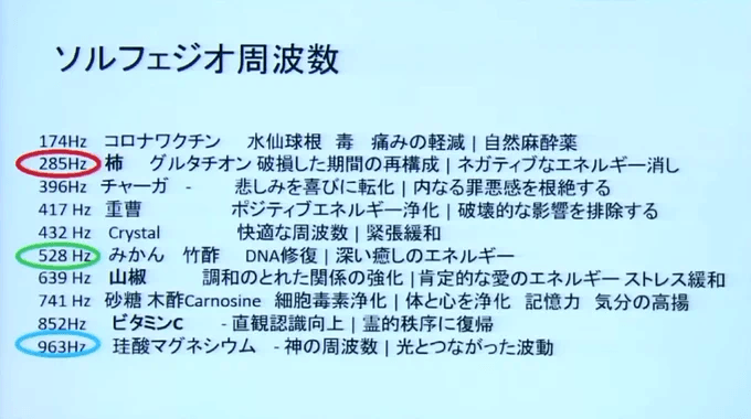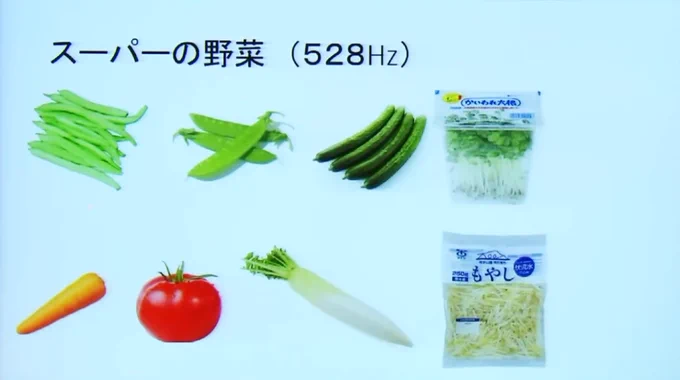 건강체 약 62~72Hz 컨디션이 양호하고 에너지가 가득한 상태 · 감기 · 인플루 전 약 58Hz 면역이 떨어지기 시작한 상태·병 진행 중 42Hz 이하 중증의 질환(암 등)이 될 가능성이 높다·사망 직전 약 20Hz 생명 활동이 한계에 접근하고 있는 【식품의 주파수(진동수) 일람(참고치)】