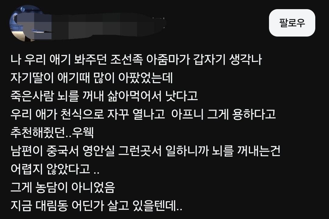 중국인 민간요법 ( feat. 인육 ) 작성자손날얼굴막기|작성시간25.09.22|조회수11 목록 댓글 0 글자크기 작게가 글자크기 크게가 중국 무비자 인육파티 조심해라 다음검색 현재 게시글 추가 기능 열기 북마크 공유하기 신고 센터로 신고 댓글 댓글 0 댓글쓰기 답글쓰기 댓글 리스트