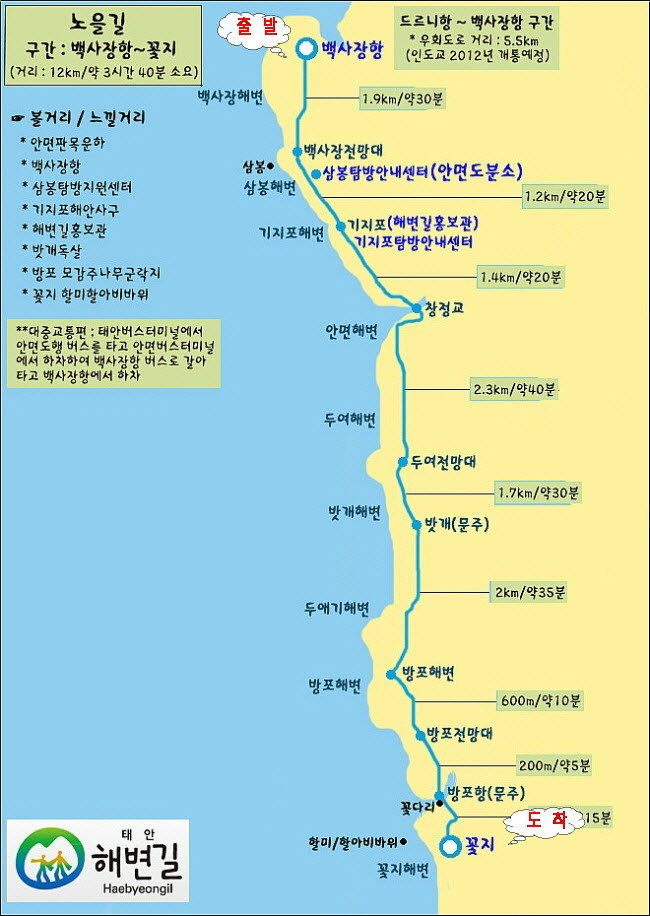 ❀ 안면도 둘레길은 총 8코스로 나뉘어 있는데 그중에 제일 멋진 코스로 5코스 노을길이 각광 받고 있다. 총거리는 12km인데 해변길과 숲길을 번갈아 가면서 즐길 수 있는 코스이다. 백사장항에서 꽃지 해수욕장까지 펼쳐져 있는 둘레길로 써 멋진 코스를 자랑한다. 특히 꽃지는 석양이 아주 일품이다.