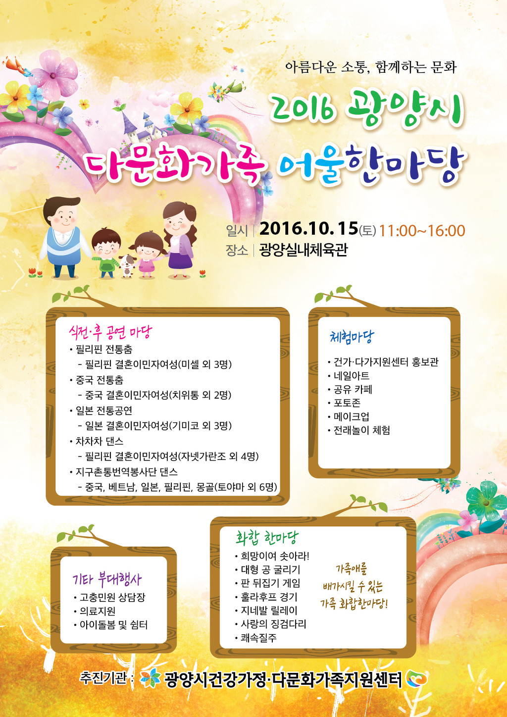 2016년 광양시 다문화가족 어울한마당 작성자김인희|작성시간16.10.07|조회수54 목록 댓글 0 글자크기 작게가 글자크기 크게가 다음검색 현재 게시글 추가 기능 열기 북마크 공유하기 신고 센터로 신고 댓글 댓글 0 댓글쓰기 답글쓰기 댓글 리스트