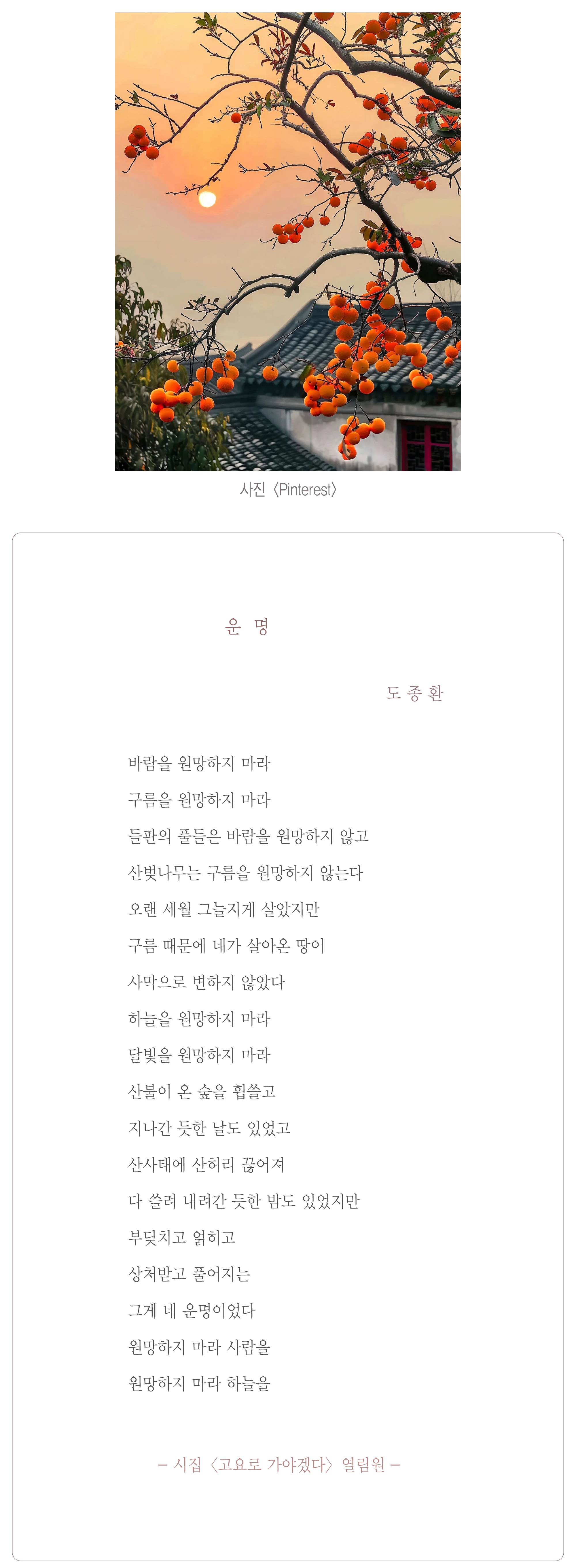 [[詩]]운명 / 도종환 『국민일보/시가 있는 휴일』 작성자운주사|작성시간25.11.15|조회수321 목록 댓글 0 글자크기 작게가 글자크기 크게가 고요로 가야겠다 | 도종환 - 교보문고고요로 가야겠다 | 한국 서정시의 거장 도종환 시인의 신작 『고요로 가야겠다』는 오랜 침묵 끝에 도달한 내면의 결실이다. 삶의 고통과 상처를 통과해 얻은 언어는 한층 더 부드럽고 다정해졌product.kyobobook.co.kr도종환 시집 〈고요로 가야겠다〉 열림원 | 2025[시가 있는 휴일] 운명바람을 원망하지 마라구름을 원망하지 마라들판의 풀들은 바람을 원망하지 않고산벚나무는 구름을 원망하지 않는다오랜 세월 그늘지게 살았지만구름 때문에 네www.kmib.co.kr운명 / 도종환 『국민일보/시가 있는 휴일』 ▷ 원본 바로 가기 Arden Forest - Blushed (Canon) 다음검색 현재 게시글 추가 기능 열기 북마크 공유하기 신고 센터로 신고 댓글 댓글 0 댓글쓰기 답글쓰기 댓글 리스트