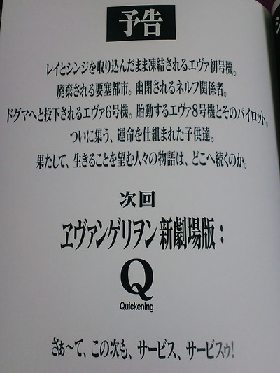 라는 내용의 예고이다. 실제음성도 그랬음. 웅성포인트는 에바8호기와 그 파일럿.부분에서 8호기도 나오냐... 라는 걸로 웅성웅성. 그리고 운명이 정한... 에서 나오는 애꾸눈 아스카부활신(!!!) 에서 관람객 모두들 크리티컬을 먹었다.