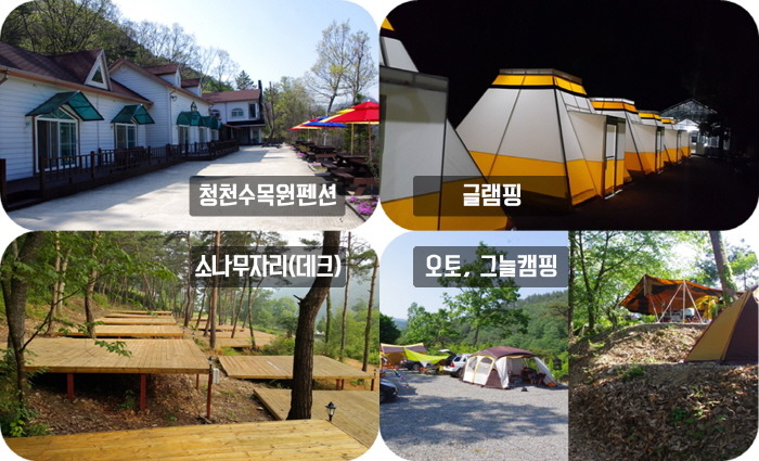 펜션은 펜션(8동), 글램핑(10동), 캠핑(69동)으로 구성되어 있습니다.