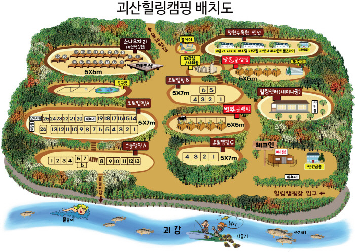 캠핑장 바로 옆에 물놀이장(괴강)이 있어 올갱이도 잡을 수 있으며, 깊지 않기 때문에 안전하게 물놀이를 즐기실 수 있습니다.