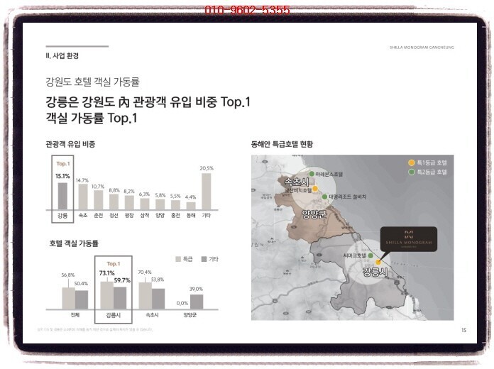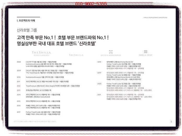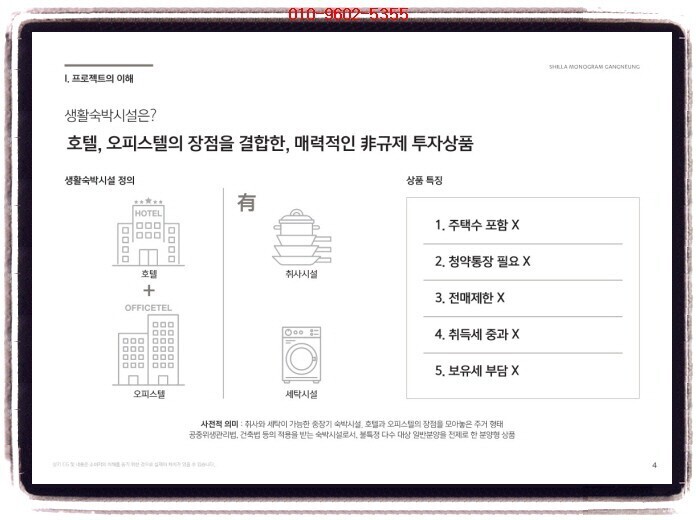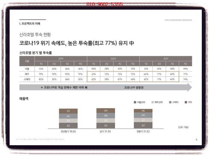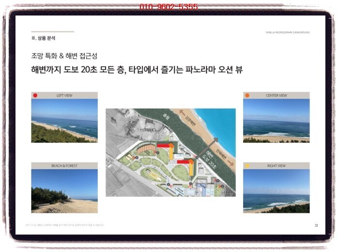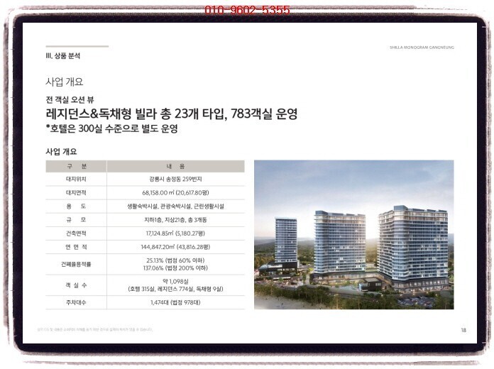 강릉 신라 모노그램(신라호텔 신규런칭) 투자의향서 <<강릉 신라 모노그램(신라호텔 신규런칭)>> ※ 생활형숙박시설 / 호텔 ✔ 현장 : 강릉시 송정동 259번지 강릉 안목해변 커피거리 옆 전호실 오션뷰 타입 ✔ 규모 및 세대수 지하 1층 ~ 지상 21층, 3개동 총 1105실 생숙 : 774호실 호텔 : 322실 독채 : 9실 ✔ 주차대수 1,474대 ✔ 일정 3~4월 예정 ✔ 청약금&방식 미정 ✔ 설계(미정) 스탠다드 628실 : 1.5룸 실사용 12~14평 스위트 100실 : 실사용 23~35평대(평균 23~25평) 펜트 & 빌...