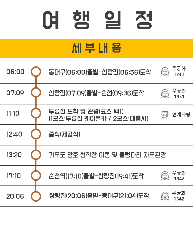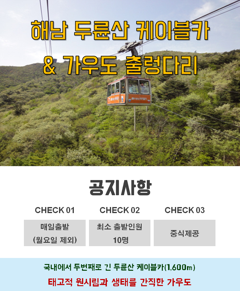 20번 :[당일]해남 두륜산 케이블카&가우도 출렁다리 작성자동대구역여행센터|작성시간17.10.20|조회수669 목록 댓글 0 글자크기 작게가 글자크기 크게가 다음검색 현재 게시글 추가 기능 열기 북마크 공유하기 신고 센터로 신고 댓글 댓글 0 댓글쓰기 답글쓰기 댓글 리스트