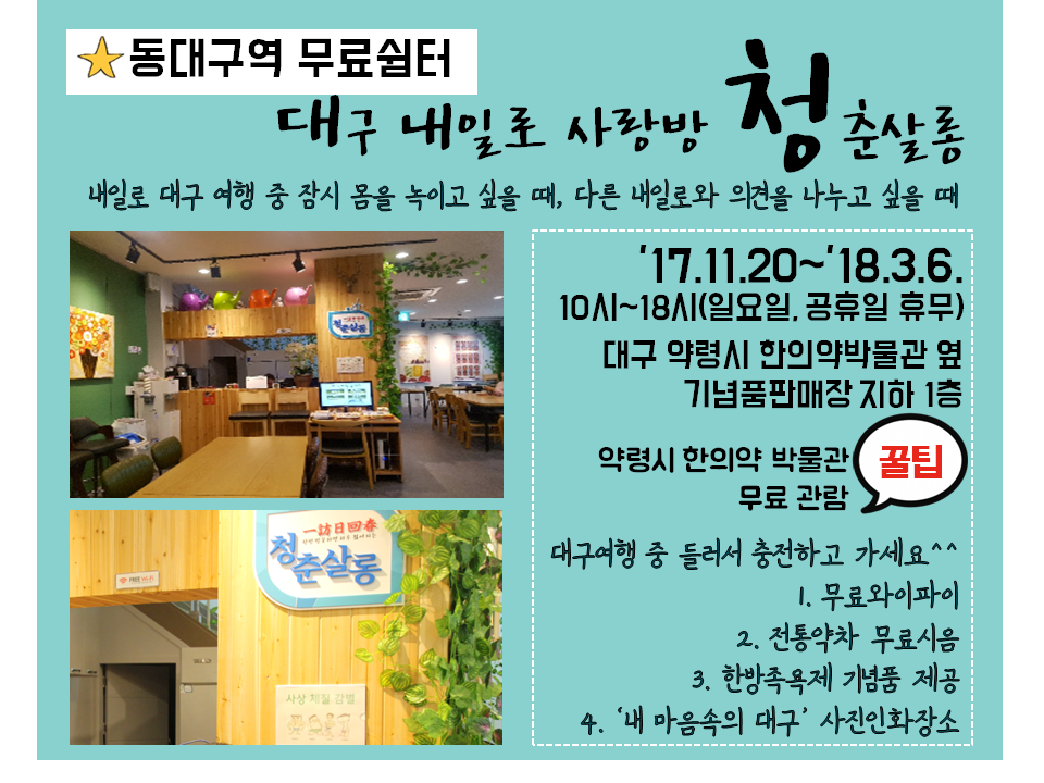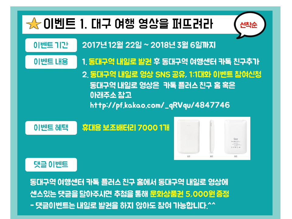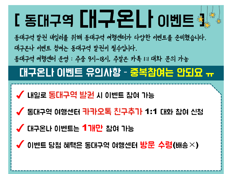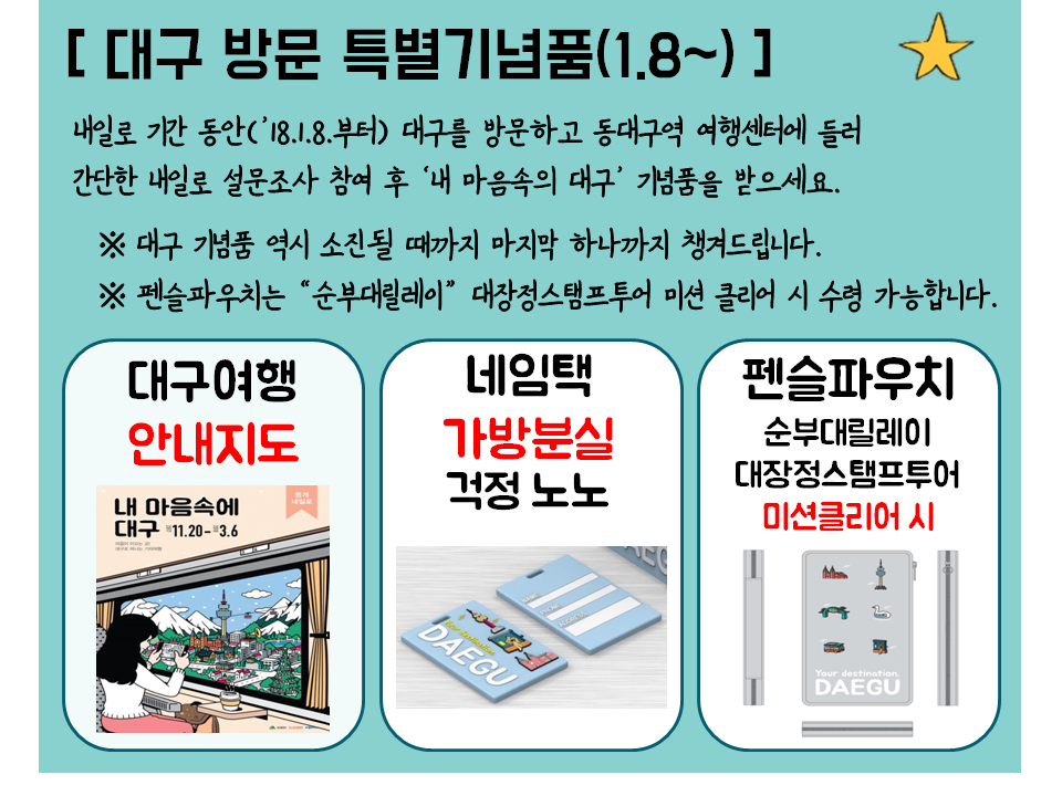 [내일로]2017-18년 동계 내일로 동대구역 발권혜택!!! 작성자동대구역투어매니저|작성시간17.12.28|조회수435 목록 댓글 0 글자크기 작게가 글자크기 크게가 다음검색 현재 게시글 추가 기능 열기 북마크 공유하기 신고 센터로 신고 댓글 댓글 0 댓글쓰기 답글쓰기 댓글 리스트