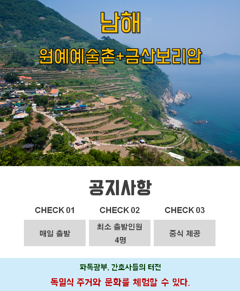 [당일][당일]남해원예예술촌&금산보리암 작성자동대구역투어매니저|작성시간17.10.20|조회수564 목록 댓글 0 글자크기 작게가 글자크기 크게가 다음검색 현재 게시글 추가 기능 열기 북마크 공유하기 신고 센터로 신고 댓글 댓글 0 댓글쓰기 답글쓰기 댓글 리스트