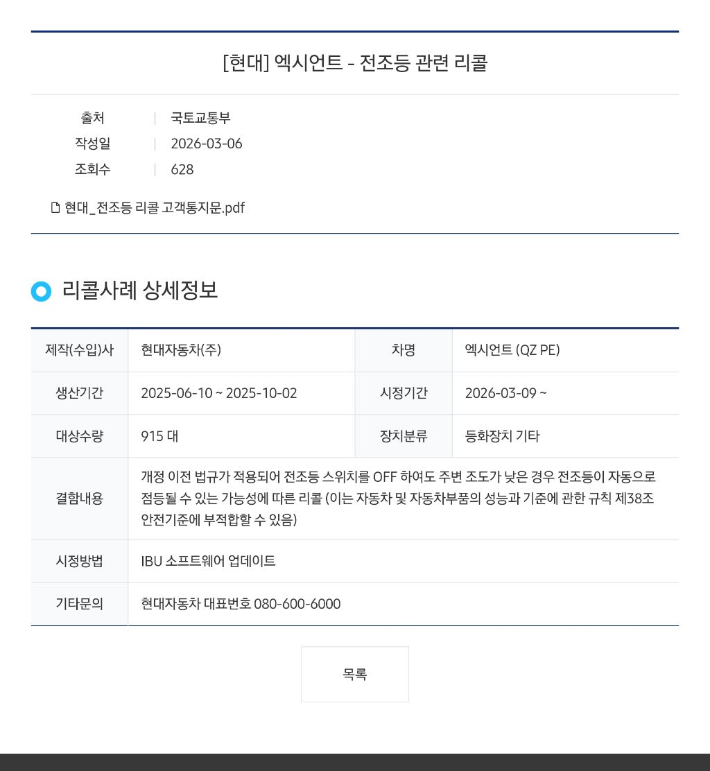 현대 엑시언트 최신형 전조등 상시점등 리콜 작성자레몬라임|작성시간26.03.30|조회수442 목록 댓글 1 글자크기 작게가 글자크기 크게가 현대_전조등 리콜 고객통지문-1.pdf391.45KB 첨부파일첨부된 파일이 2개 있습니다. jpg 파일 resized_Screenshot_20260330_103347_Samsung Internet.jpg pdf 파일 현대_전조등 리콜 고객통지문-1.pdf 다음검색 현재 게시글 추가 기능 열기 북마크 신고 센터로 신고 댓글 댓글 1 댓글쓰기 답글쓰기 댓글 리스트 작성자박정호 | 작성시간 26.03.30 엑시언트 전부 리콜해야하는것아닐까요?밤이고 낮이고 전부 상향등 특히 불법 엘이디 넣은차들... 극혐 댓글 전체보기