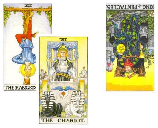 첫번째 현재상황 타로카드로는 매달린 사람이 나왔다. 두번째 장애, 차단, 제한, 문제상황 타로카드로는 전차 카드가 나왔다. 마지막으로 조언,해답,결과상황 타로카드로는 King of Pentacles 역방향이 나왔다.