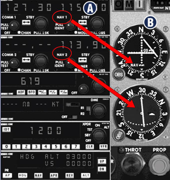 만약 VOR전파가 수신되는 범위내에 있다면 B위치에 있는 계기가 반응을 할 것입니다. (NAV1에 주파수를 맞추셨다면 위쪽 계기가, NAV2쪽에 주파수를 맞추셨다면 아래쪽 계기가 반응합니다.)