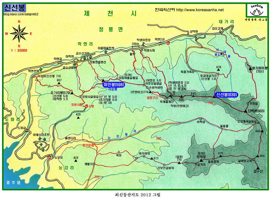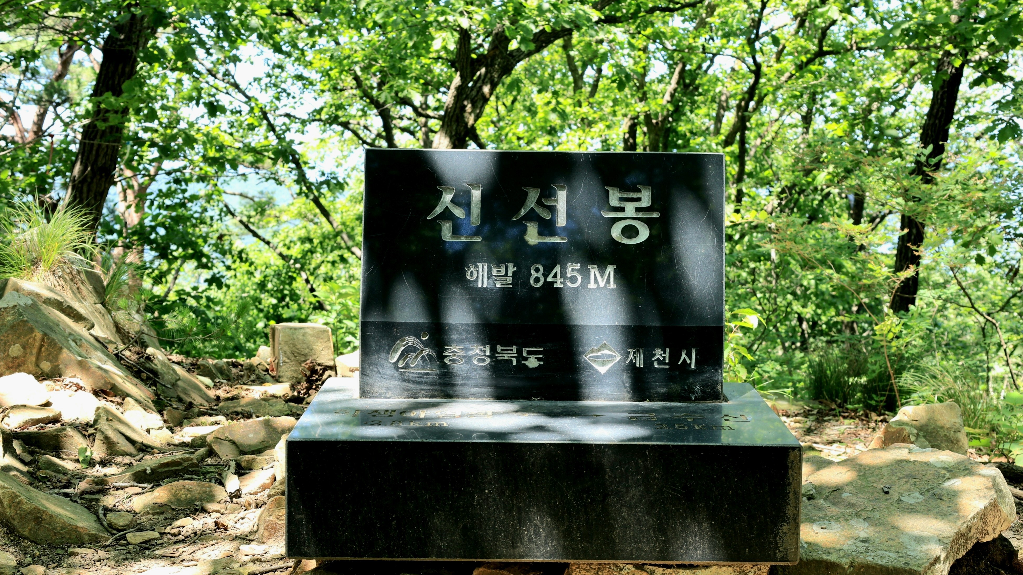신선봉(845m)은 충북 제천시 청풍면 학현리와 수산면 능강리 경계에 솟은 산으로 금수산(1,016m)과 동산(896m) 사이에 서북쪽