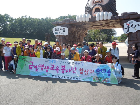 인천광역시북구도서관(관장 김창수)에서 운영되고 있는 「금빛평생교육봉사단」86명이 봉사자간 유대 강화와 활동 의욕고취를 위한 참살이 워크숍를 실시(10월 6일(목) 하였습니다. 탐방장소는 1978년 선사유적지인(사적 제268호)경기 연천 전곡리 유적지와 임진강과 더불어 아름다운 풍경이 펼쳐지고 있는 허브빌리지였습니다.