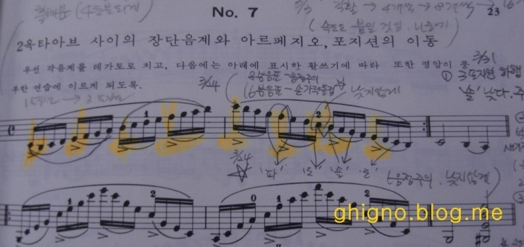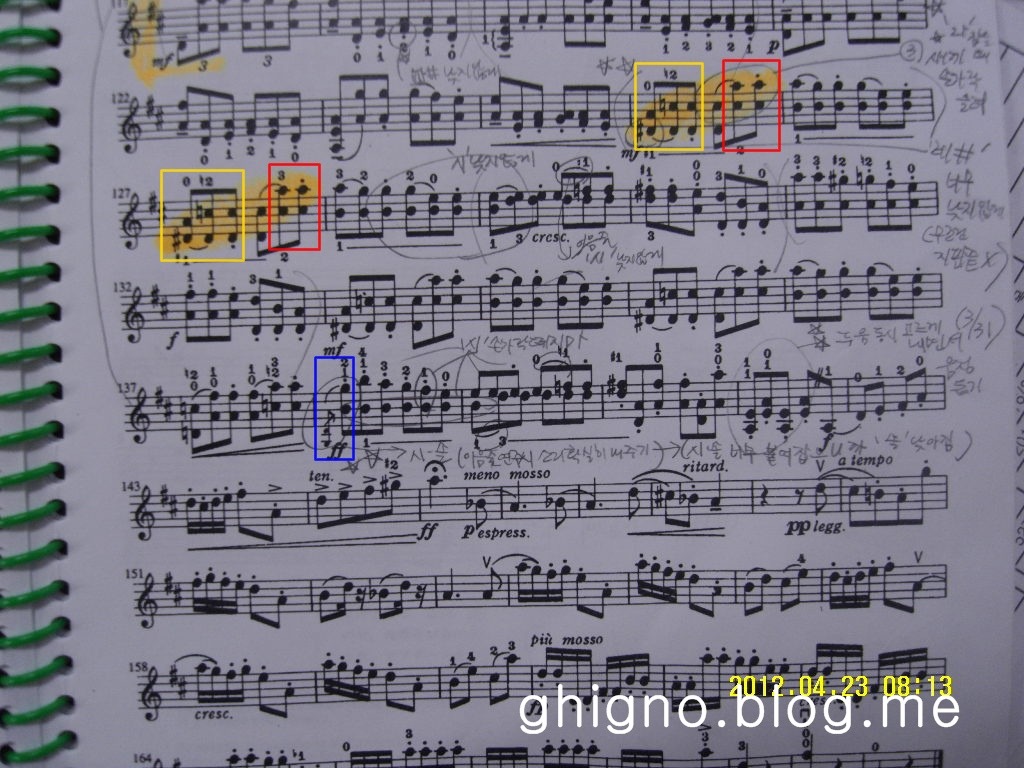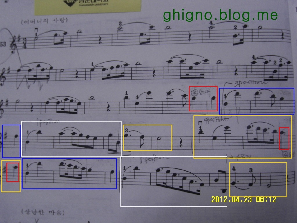 빨간 박스 '라'를 4포지션의 a현 4번 손꾸락 썼어야 했는데 저길 써드의 1번 손꾸락으로 썼었음.
