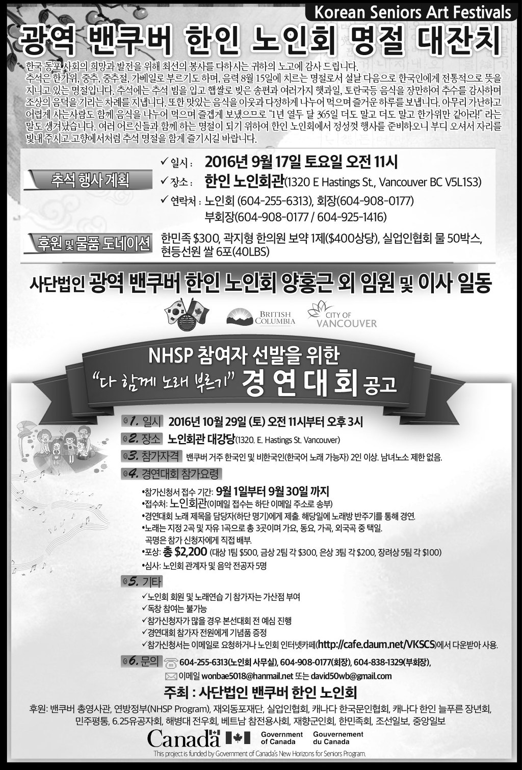 2016년 추석행사 및 한인 시니어 예술제(Korean Senior Arts Festival) 안내 작성자밴쿠버노인회|작성시간16.09.02|조회수258 목록 댓글 0 글자크기 작게가 글자크기 크게가 다음검색 현재 게시글 추가 기능 열기 북마크 공유하기 신고 센터로 신고 댓글 댓글 0 댓글쓰기 답글쓰기 댓글 리스트