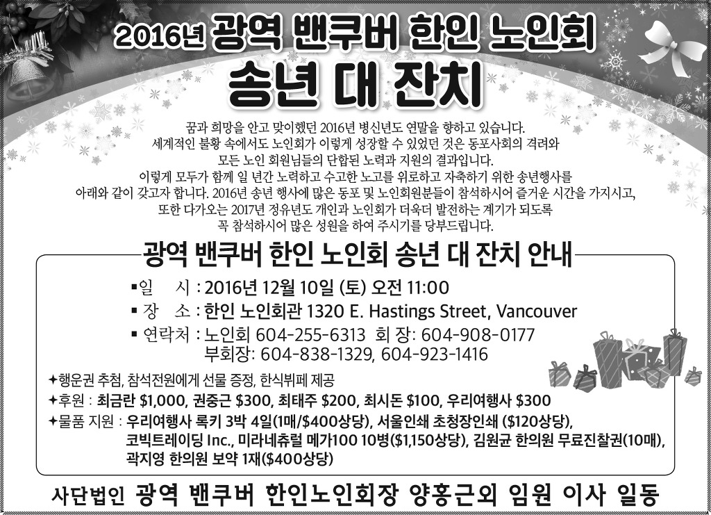 2016년 광역밴쿠버 한인노인회 송년회 안내 작성자밴쿠버노인회|작성시간16.11.25|조회수191 목록 댓글 0 글자크기 작게가 글자크기 크게가 다음검색 현재 게시글 추가 기능 열기 북마크 공유하기 신고 센터로 신고 댓글 댓글 0 댓글쓰기 답글쓰기 댓글 리스트
