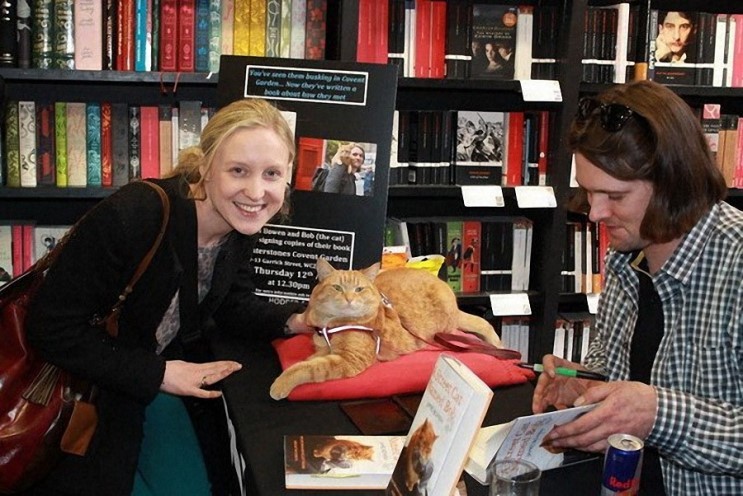 서점에서 사인을 하고 있는 제임스씨와 고양이 밥.