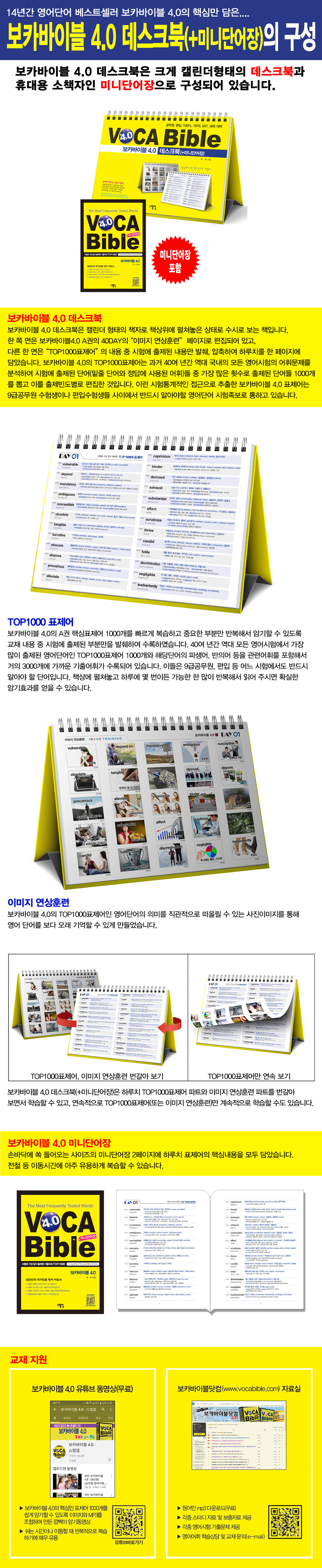 보카바이블 4.0 - 데스크북(+미니단어장)은 캘린더 형태의 책자로 책상위에 펼쳐놓은 상태로 수시로 보는 책입니다. 한 쪽 면은 보카바이블4.0 A권의 40DAY의 “이미지 연상훈련” 페이지로 편집되어 있고, 다른 한 면은 “TOP1000표제어”의 내용 중 시험에 출제된 내용만 발췌, 압축하여 하루치를 한 페이지에 담았습니다. 보카바이블 4.0의 TOP1000표제어는 과거 40여 년간 역대 국내의 모든 영어시험의 어휘문제를 분석하여 시험에 출제된 단어(밑줄 단어와 정답에 사용된 어휘)들 중 가장 많은 횟수로 출제된 단어들 1000개를 뽑고 이를 출제빈도별로 편집한 것입니다. 따라서 역대 영어시험 중 총 31회 이상 출제된 vulnerable이 0001번으로 나옵니다. 이 영어단어는 여전히 매년 각종시험에서 한 번 이상 출제되고 있습니다. 이런 시험통계적인 접근으로 추출한 보카바이블 4.0 표제어는 9급공무원 수험생이나 편입수험생들 사이에서 반드시 알아야할 영어단어 시험족보로 통하고 있습니다.