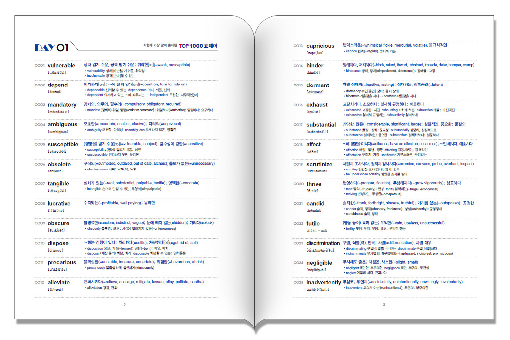 편의성, 집중도를 높이기 위해 핵심적인 내용만 압축하여 편집한 것이기 때문에 예문도 수록되어 있지 않기 때문에 집중해서 학습하는 것은 본서인 보카바이블 4.0으로 학습하고 복습은 보카바이블 4.0 데스크북(+미니단어장)으로 하는 것을 추천 드립니다. 물론 보카바이블 4.0이 아니라 다른 영어단어교재로 공부한 수험생이 보카바이블 4.0의 표제어를 빠른 시간에 보충하고자 할 때에는 유용하게 사용될 수 있습니다.