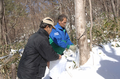 눈이 채 녹지 않은 지리산 자락 해발 500~1000m 고지대에서 주민들이 고로쇠 수액을 채취하고 있다.
